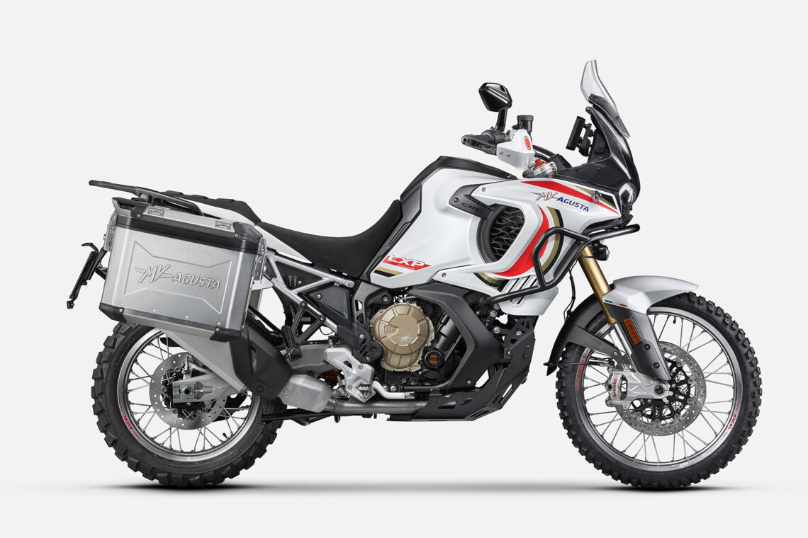 La MV Agusta LXP Orioli 2024 rompe la tendencia 100% asfáltica de la exclusiva firma italiana, adentrándose en el competido segmento de las monturas maxitrail-aventura. Nada es heredado de otros modelos, empezando por su motor tricilíndrico en línea DOHC de 931 cc (sólo pesa 57 kg) con 124 CV a 10.000 rpm y 102 Nm a 7.000 rpm. Llantas de radios (21" delante y 18" detrás), pinzas Brembo Stylema, 4 modos de conducción (Urban, Touring, Off-Road, Custom All-Terrain), control de tracción (cinco niveles, desc.), freno motor electrónico (dos niveles) y ABS en curva con RLM (Rear Wheel Lift-Up Mitigation), control de velocidad, llave de proximidad, conectividad Bluetooth (app MV Ride) con TFT a color de 7", iluminación full-LED y piñas retroiluminadas redondean el conjunto.