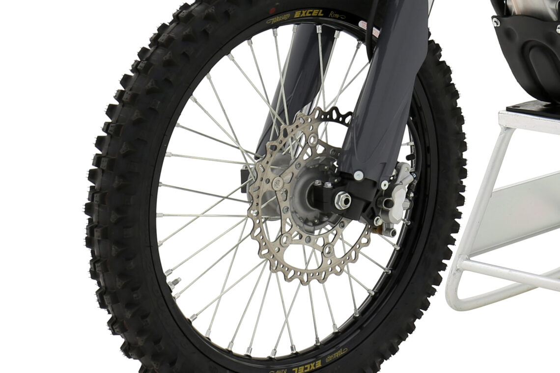 Respecto a su parte ciclo, cuenta con un chasis de aluminio de doble viga. Sus suspensiones KYB presentan una horquilla de resorte delantera con 310 mm de recorrido y ajustable, mientras que detrás dispone de un amortiguador simple, también ajustable y con un recorrido de 318 mm. Sus llantas Excel son de 21 pulgadas delante (80/100-21) y 19 detrás (100/90-19). Y, por último, dispone de frenos hidráulicos, siendo un disco delantero de 270 mm, accionado en la maneta derecha, y un disco trasero de 240 mm detrás que se acciona con el pie derecho. Cabe destacar que, al no tener embrague, no hay maneta o palanca de cambio en el puño y estribera del lado izquierdo.