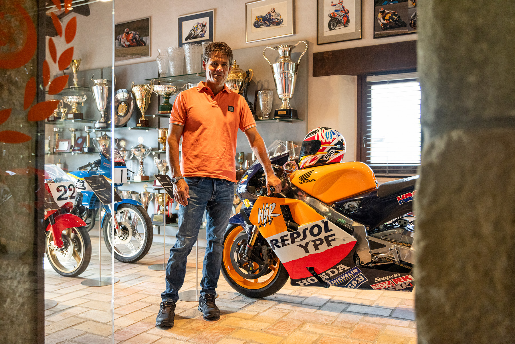 En su museo, presidido por la icónica Honda NSR500 con la que fue campeón de la máxima categoría, y en el que también figuran las principales motos de su carrera deportiva, monos, cascos y todos sus trofeos, transcurre esta amplia entrevista que repasa su trayectoria, sus vivencias y algunas anécdotas de toda una leyenda del motociclismo.