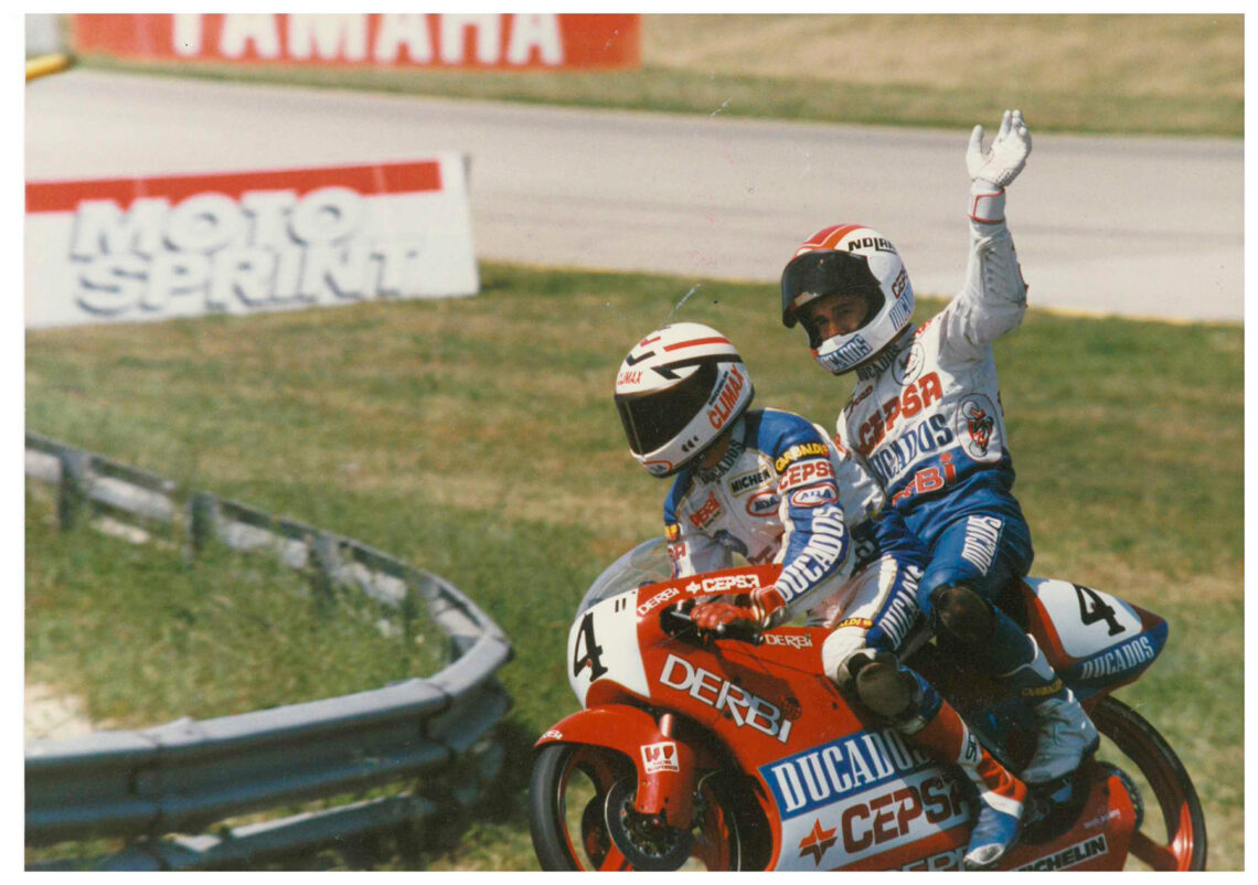 Y luego con la de Yamaha, estaba con Marlboro y demás, y yo estaba con Ducados. En fin, como digo, es muy fácil mirar hacia atrás ahora que se podía haber hecho diferente. Pero sí que hubiese encantado tener una moto oficial en 250cc y haber luchado de tú a tú contra Carlos Lavado, Martin Wimmer o los pilotos de aquella época de 250cc.