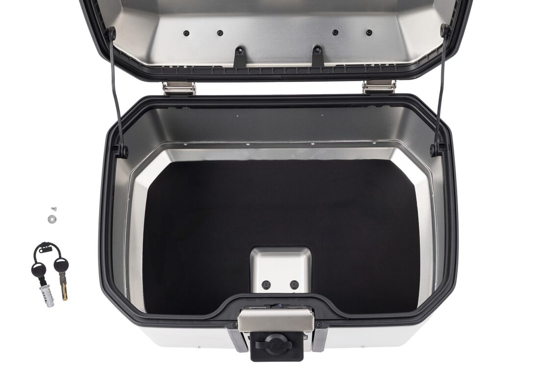 En cuanto a dimensiones, el X55 mide 57 cm de ancho, 41,8 cm de alto y 32,2 cm de profundidad, admite una carga máxima de 10 kg y está disponible en acabado de aluminio natural o en color negro. El soporte para baúl no está incluido, ya que varía según el modelo de moto, y debe pedirse por separado.