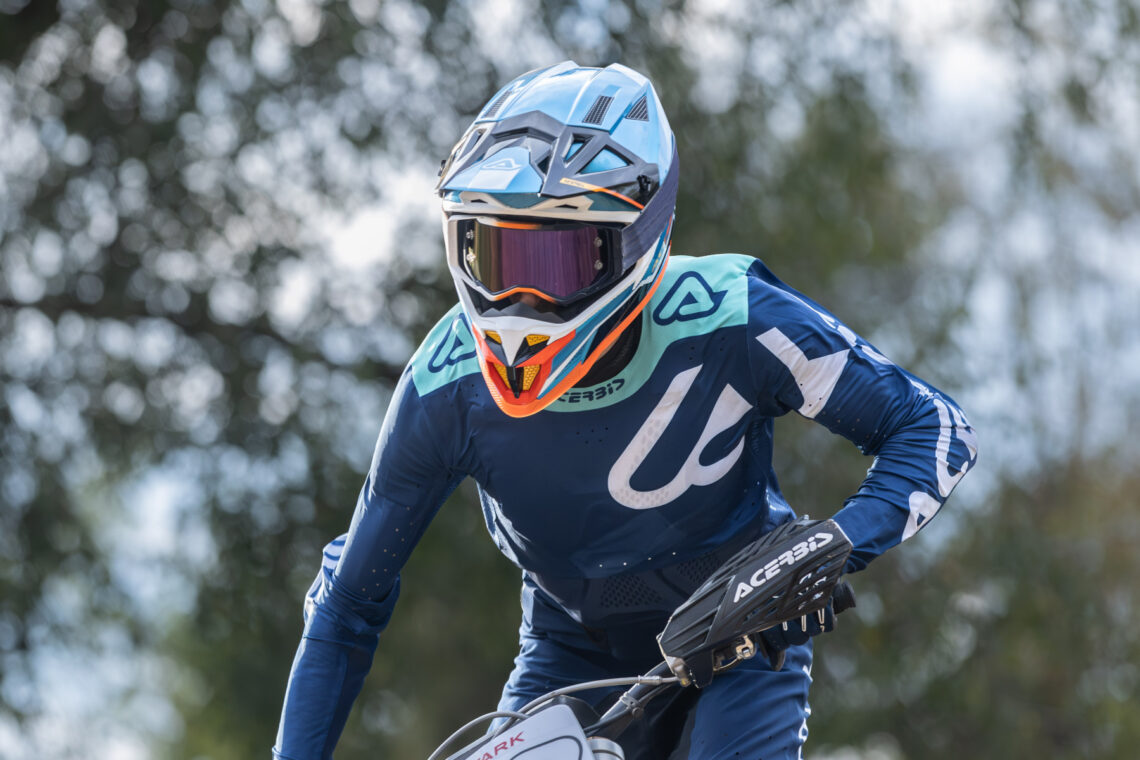 Este casco está fabricado en fibra con una doble calota exterior y una calota completa que garantizan ligereza y rigidez al producto. Su peso total no supera los 1.300 gramos (1100 ± 50 gr en talla M). La visera con longitud ajustable, en la parte final, es fruto de una cuidadosa colaboración entre el equipo técnico y los pilotos, la cual ha permitido garantizar un menor impacto del barro en la máscara durante la conducción.