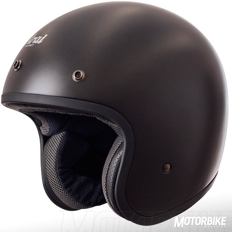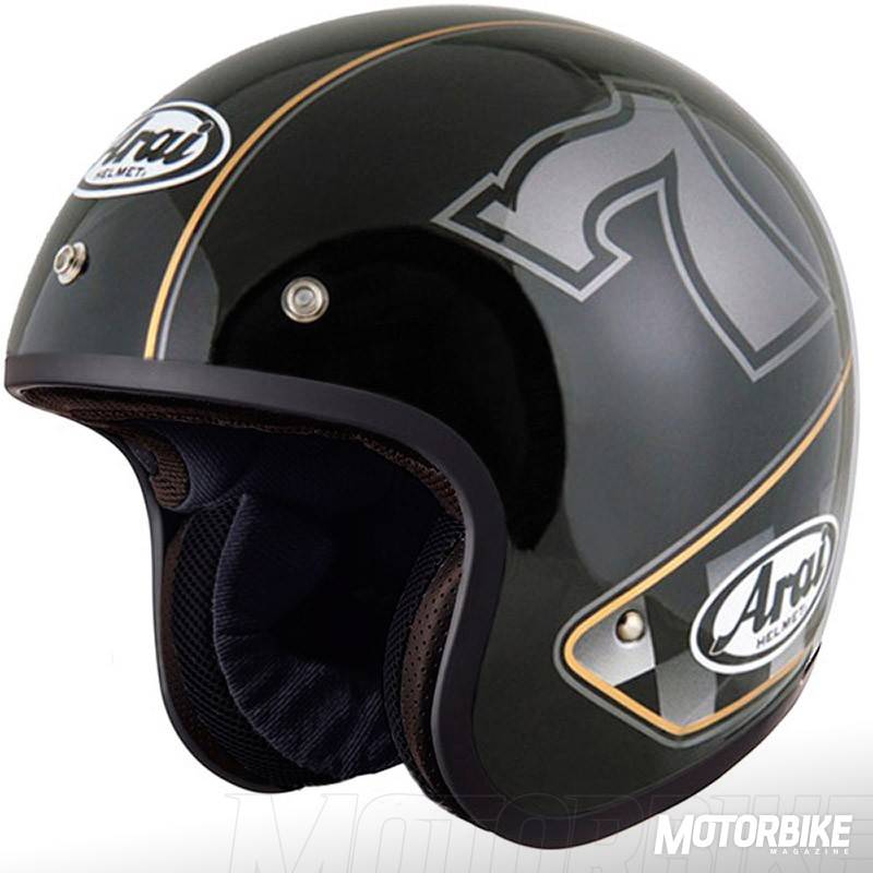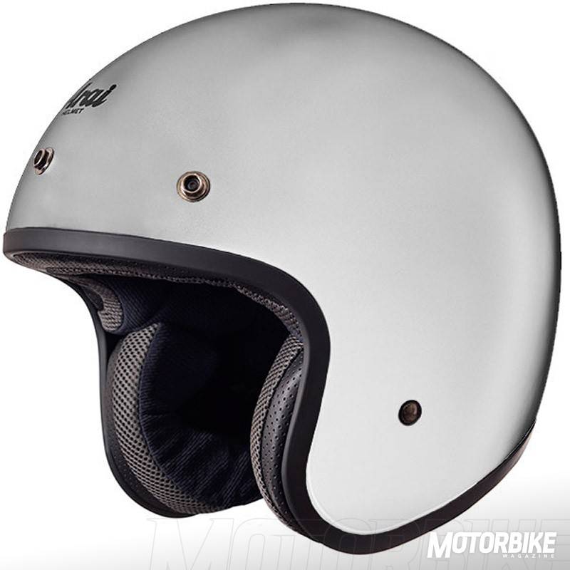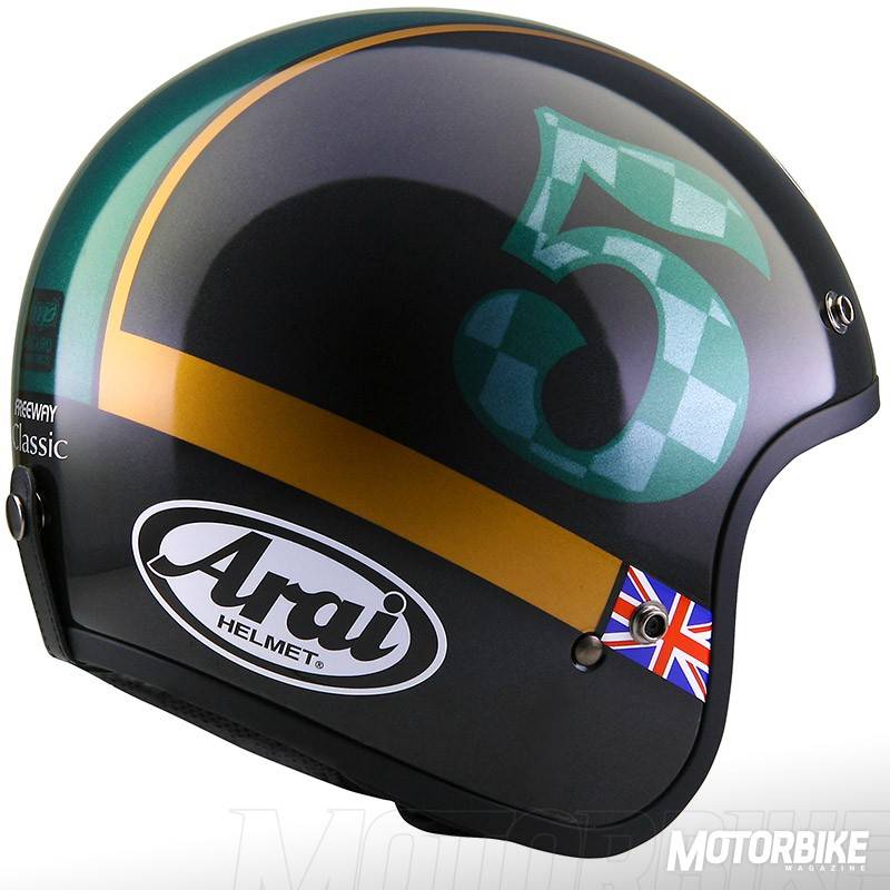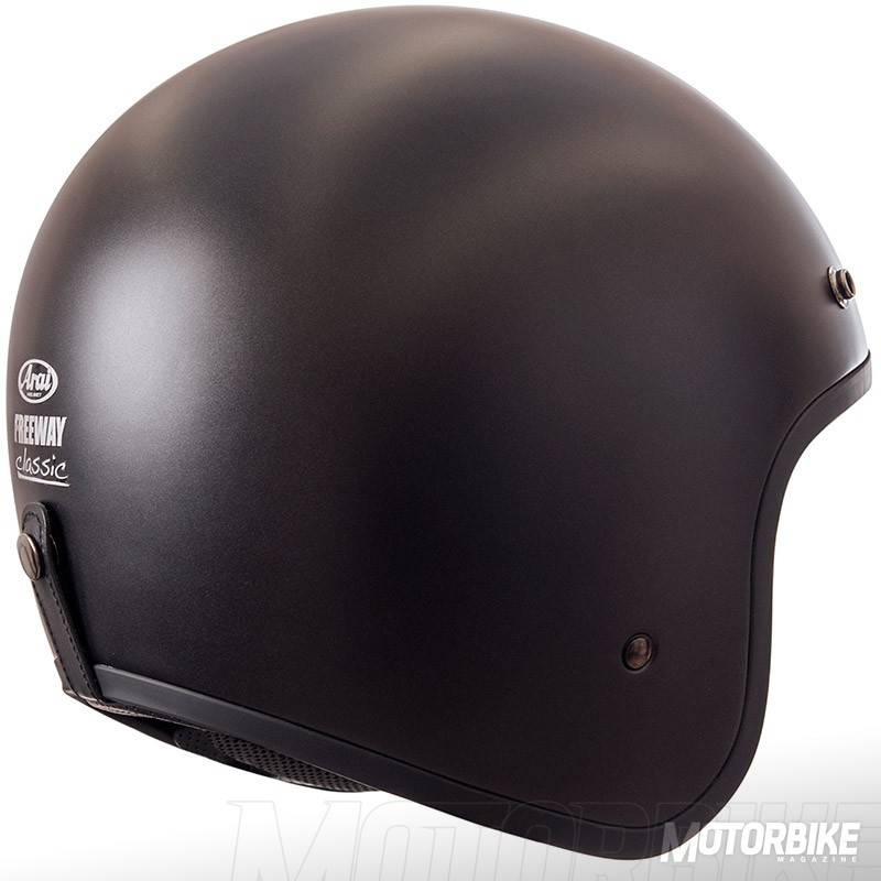 El modelo Freeway Classic de Arai está fabricado en súper fibra laminada, y viene con cinco botones a presión en el área frontal. Los tres superiores sirven para sujetar una visera (que viene incluida con el casco) y en conjunto para añadir una visera tipo “bubble”. Cuenta también con una banda posterior para sujetar la cinta de unas gafas (no incluidas). Sus acabados interiores son en piel sintética, suave y flexible y sus acolchados laterales son extraíbles, y vienen con dos láminas de espuma de distinto grosor que son regulables hasta 5mm para adaptar el casco perfectamente a la cara del usuario. En la zona de las orejas, trae un amplio espacio que facilita el uso de intercomunicadores y su cierre es de tipo de doble anilla. Las tallas disponibles van de la XS a la XXL.