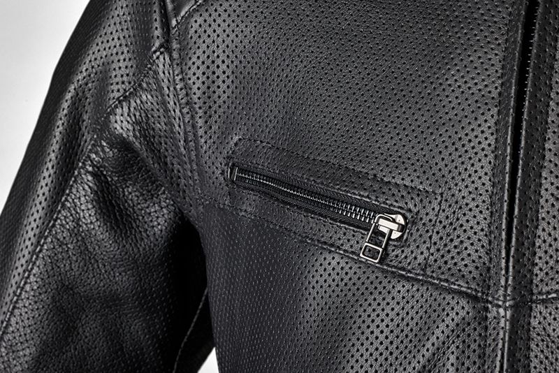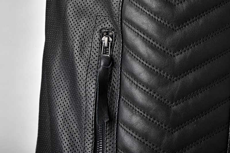 Se trata de una chaqueta estilo vintage, una mezcla entre elegancia y un toque rebelde. Cuenta con certificación CE de Nivel A y protecciones de Nivel 1 en codos y hombros, y está fabricada en piel anilina perforada de primera calidad. Además, en la zona de la espalda se incluye un bolsillo para añadir espaldera si así se desea. Esto se traduce, en definitiva, en un altísimo grado de seguridad para el motorista.