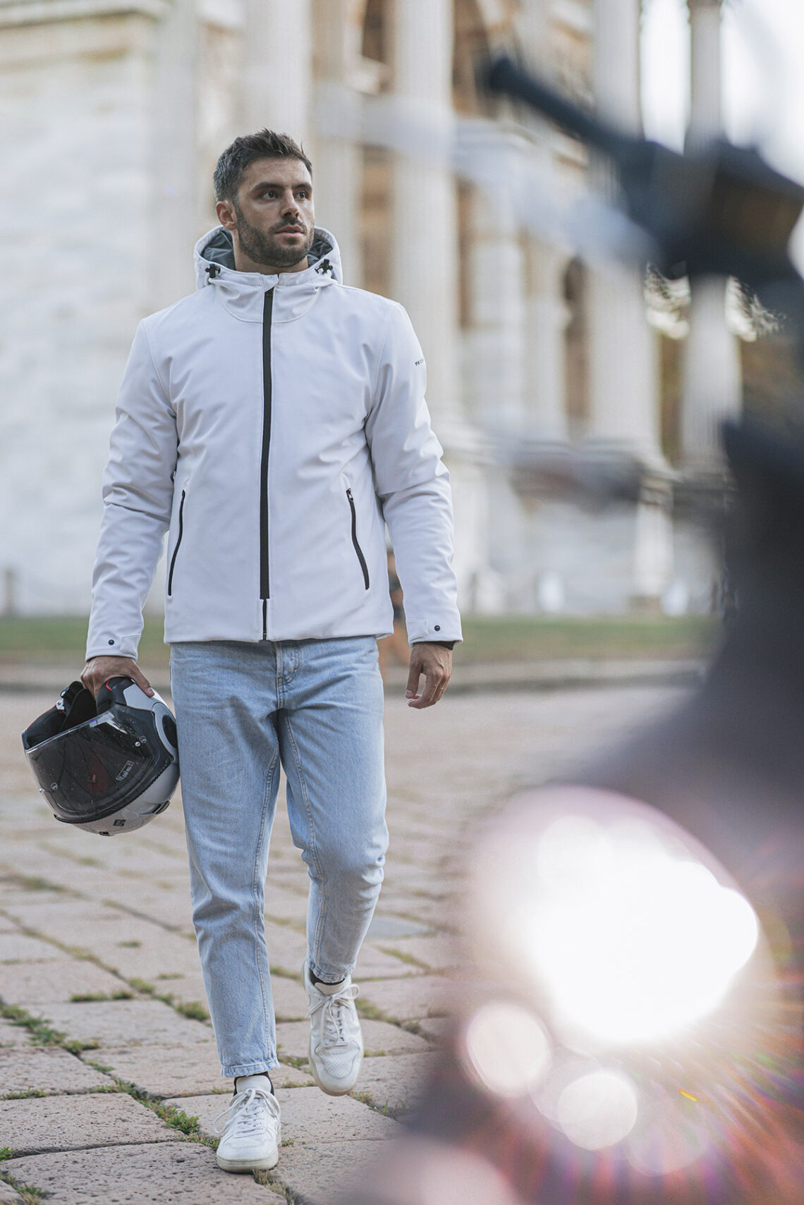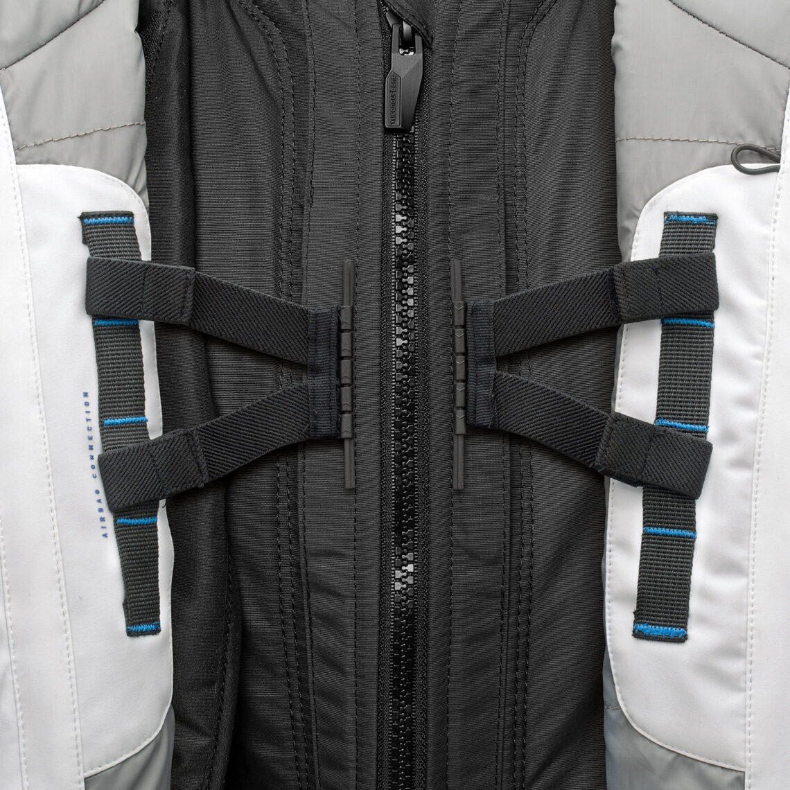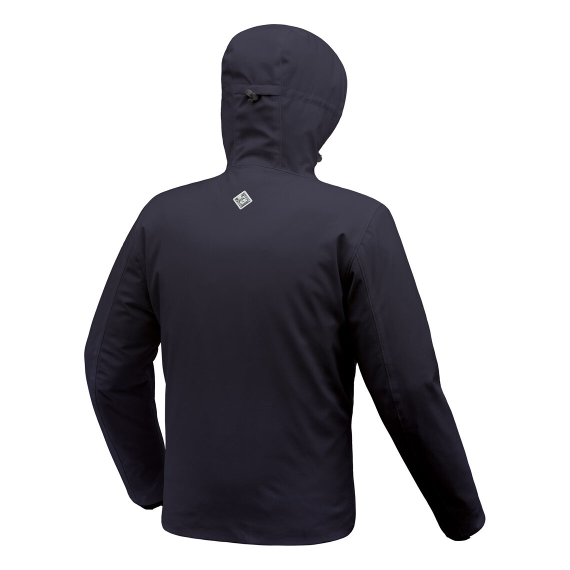 Sus características incluyen una capucha ergonómica y ajustable antideslizante, una cremallera central con solapa (protege el depósito de arañazos), un elástico para enganchar los auriculares, bolsillos interiores/exteriores de varios tamaños que permiten llevar los objetos más esenciales y ajuste en el bajo mediante cordón y puños ajustables. También puede completarse con sistema AIRSCUD CONNECTION para acoplar el chaleco AIRBAG IN&MOTION.