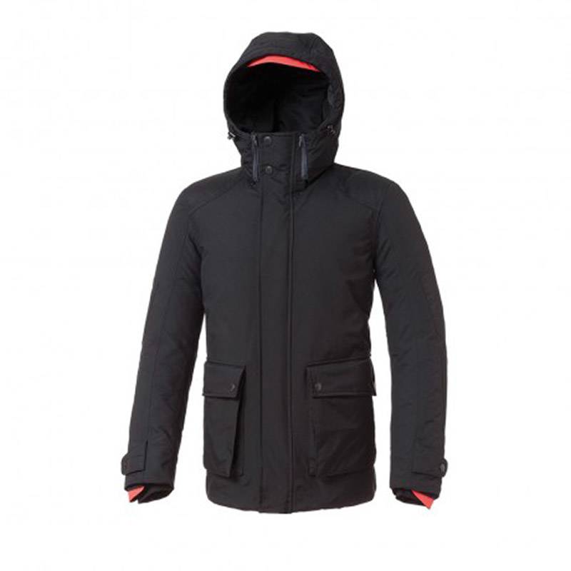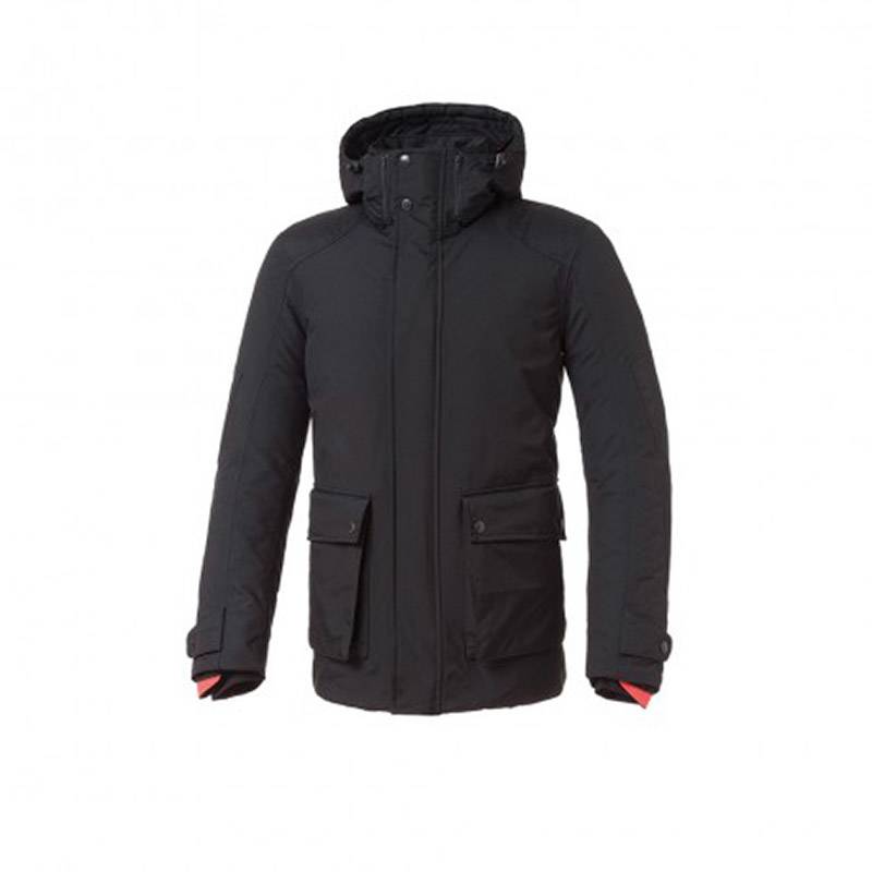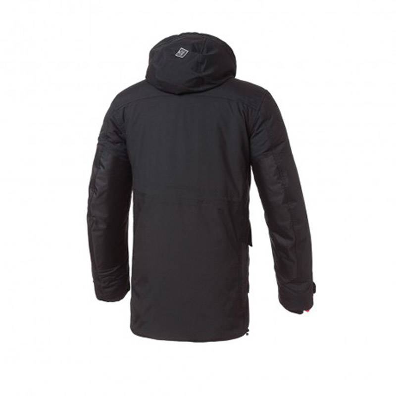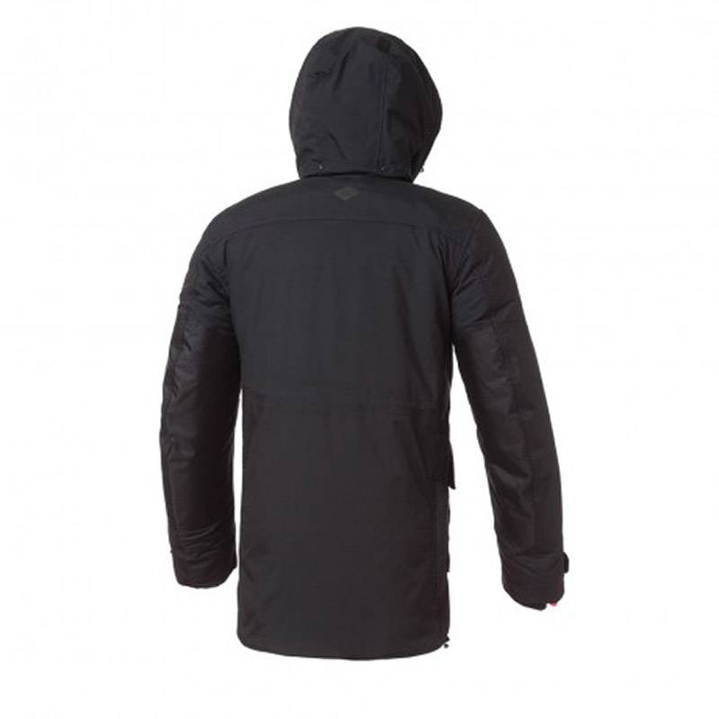 El modelo Park es una parka fabricada con Hydroscud, un sistema de Tucano Urbano fabricado en poliamida Oxford transpirable, cortavientos e impermeable y con un forro térmico de poliéster. Sus costuras están termoselladas y viene con protecciones de nivel 1 en los codos. Viene con predisposición para instalar protecciones en hombros y espalda (no incluidas) y tiras reflectantes de alta visibilidad que se pueden esconder cuando no hay falta de luz. Tiene cierre elástico en las muñecas y viene con una capucha ergonómica desmontable, por lo que el uso de este modelo no se limita solo a la moto. También tiene regulación en la cintura y múltiples bolsillos interiores para llevar distintos objetos, incluyendo uno en el que cabe una tableta tipo iPad. Tan sólo la puedes encontrar en color negro y en tallas que van de la S a la 3XL.