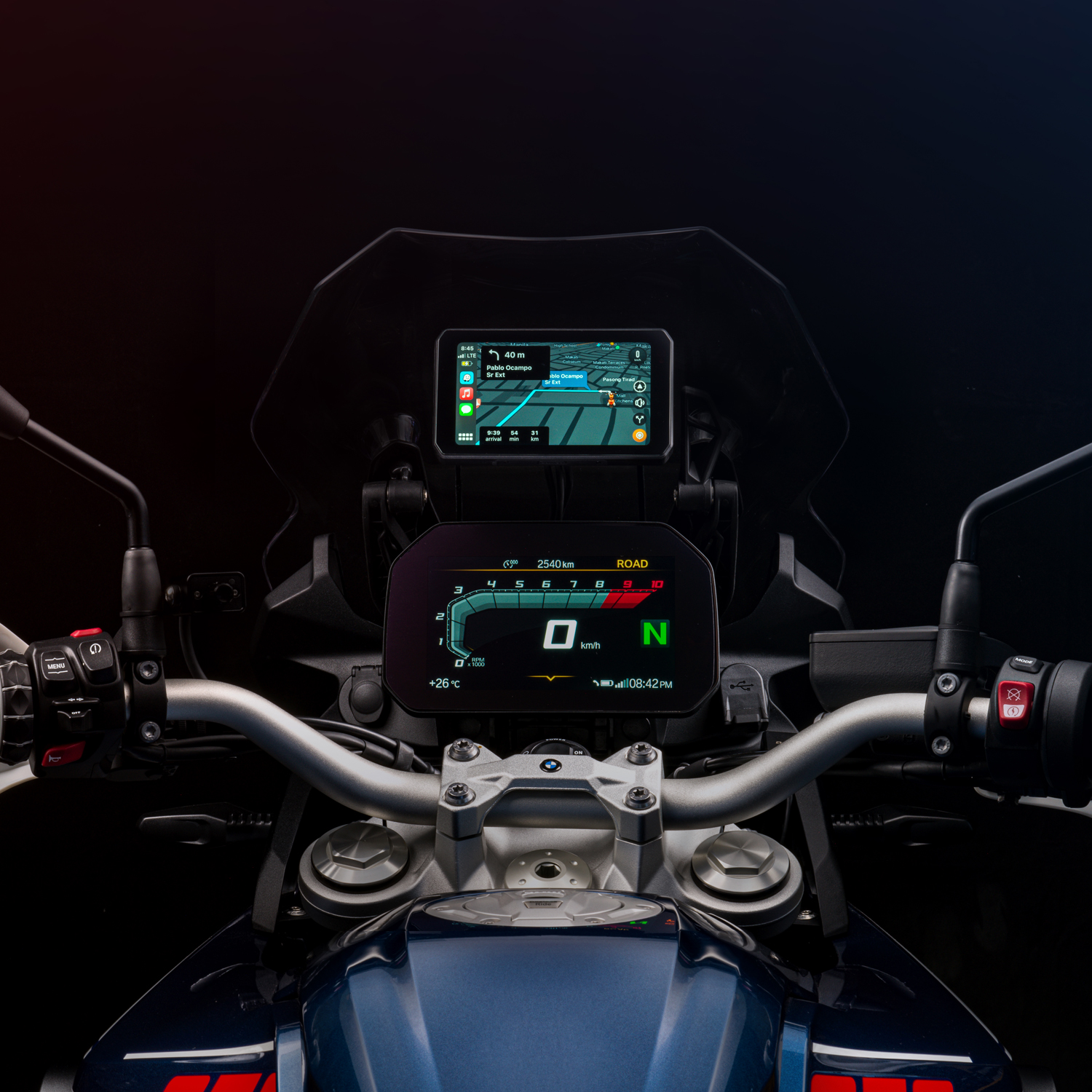 Pensado para integrarse sin esfuerzo en el cuadro de la moto, el AIO-5 Play se alimenta directamente de la batería de la misma. Su instalación es sencilla gracias a los soportes incluidos y la posibilidad de adquirir soportes adicionales, y el cable de alimentación de 208 cm permite una colocación ordenada y discreta. Con certificación IP68, este sistema es resistente al polvo y al agua, operando eficazmente en un rango de temperaturas que va desde -20º hasta 60º, lo que lo hace ideal para cualquier clima y situación.