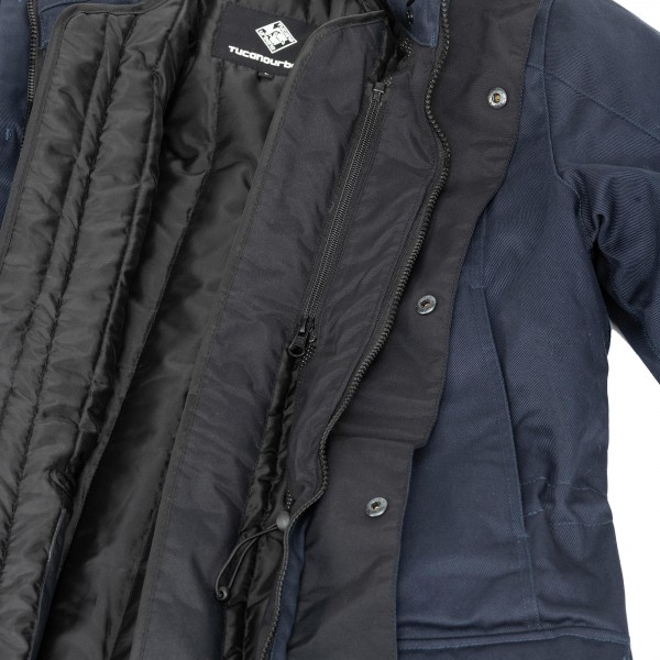 Tucano Urbano, que se caracteriza por ofrecer prendas con un estilo y una apariencia muy cuidada y ligera, ha otorgado a la Stanley Park de una capucha desmontable y ajustable, decorada con un ribete de piel sintética desmontable. Para aumentar su polivalencia y permitir su uso en días más primaverales, la chaqueta interior acolchada térmica se puede quitar.