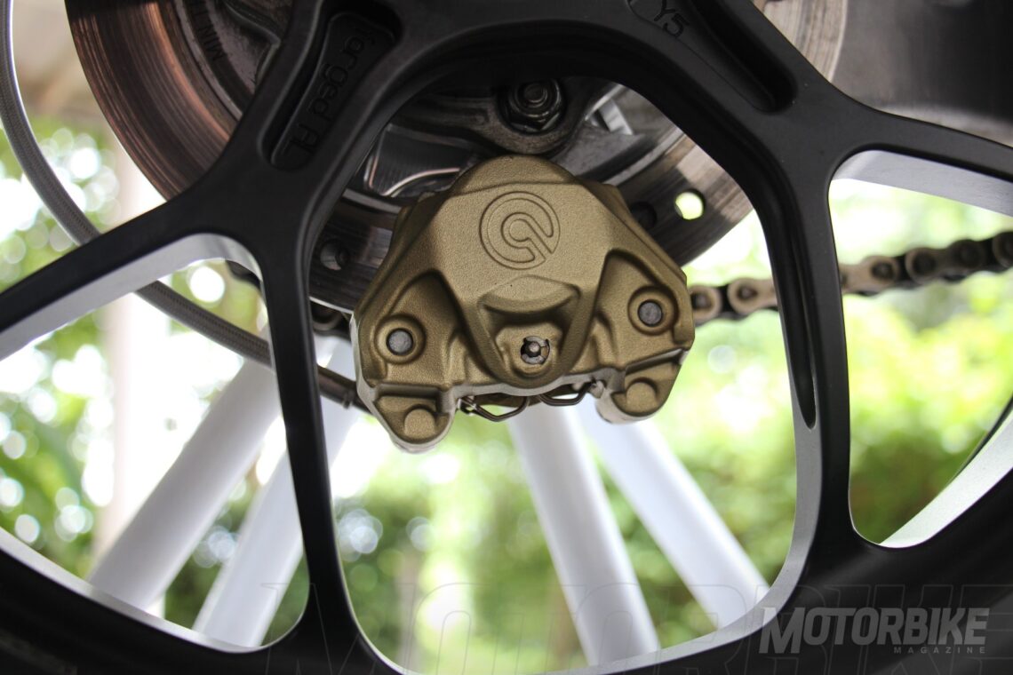 Además desde Tyga también se han "mojado" un poco más y han preparado la moto con piezas de alto rendimiento, como la suspensión delantera Showa o la bomba de freno radial Brembo, sin olvidar los latiguillos metálicos HEL. La pinza de freno trasera Brembo cuenta con el sistema de sujeción Tyga. La suspensión trasera es de la marca Tyga, especialmente diseñada para este modelo y para las NSR250 F3, y las llantas son de PVM, esclusivas de Tyga Performance, fabricadas en aluminio forjado, mucho más ligeras.