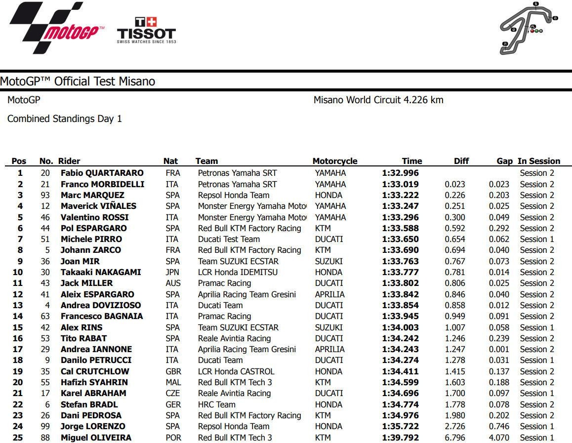 Yamaha se marcha de la primera jornada del test de Misano como el rival a batir, aspecto a tener muy en cuenta dada la cercanía del GP de San Marino en este mismo escenario, que se disputará del 13 al 15 de septiembre. Las cuatro Yamaha de la parrilla han acabado en el top 5: 1º Quartararo, 2º Morbidelli, 4º Viñales y 5º Rossi. Entre medias, cómo no, Marc Márquez, el que siempre está ahí. El líder del campeonato terminaba tercero a dos décimas del registro de Quartararo. El #93 llegó a sufrir una caída leve durante las primeras horas de entrenamiento.