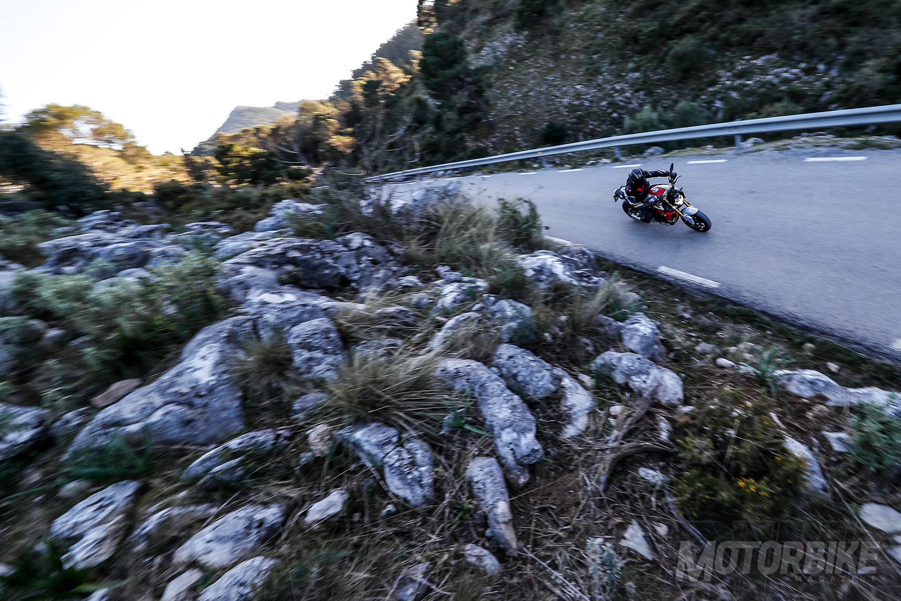 Empiezan los primeros ataques, una sucesión de curvas enlazadas. La Z900 llega muy rápido a ella, mucho motor, necesita frenar más fuerte. Gracias a su gran manillar ancho, puede realizar buena palanca y meter la moto con mucha efectividad, se mantiene en ella con aplomo pero... sale un poco lenta. Parece ser que el excesivo motor pone en demasiado compromiso al neumático trasero y el control de tracción corta en exceso. No parece estar siendo tan efectiva como la BMW, que si bien no llega tan rápido a las curvas, precisa frenar menos, entra con más naturalidad. El compacto motor de dos cilindros ayuda bastante en este caso, menos inercia, menos cilindros, menos envergadura, y sale desde abajo aprovechando toda la tracción del motor, increíble, muy fluida, muy suave, muy natural.
