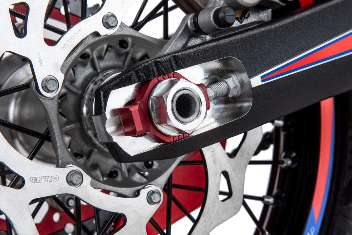 - Perno de la rueda aumentado. El perno de la rueda trasera se ha reforzado, ganando 2 mm de diámetro, pasando por tanto a 22 mm. Este nuevo componente garantiza una mayor rigidez y resistencia a la torsión. También se actualizan la pinza del freno trasero y los espaciadores de las ruedas para que encajen perfectamente.