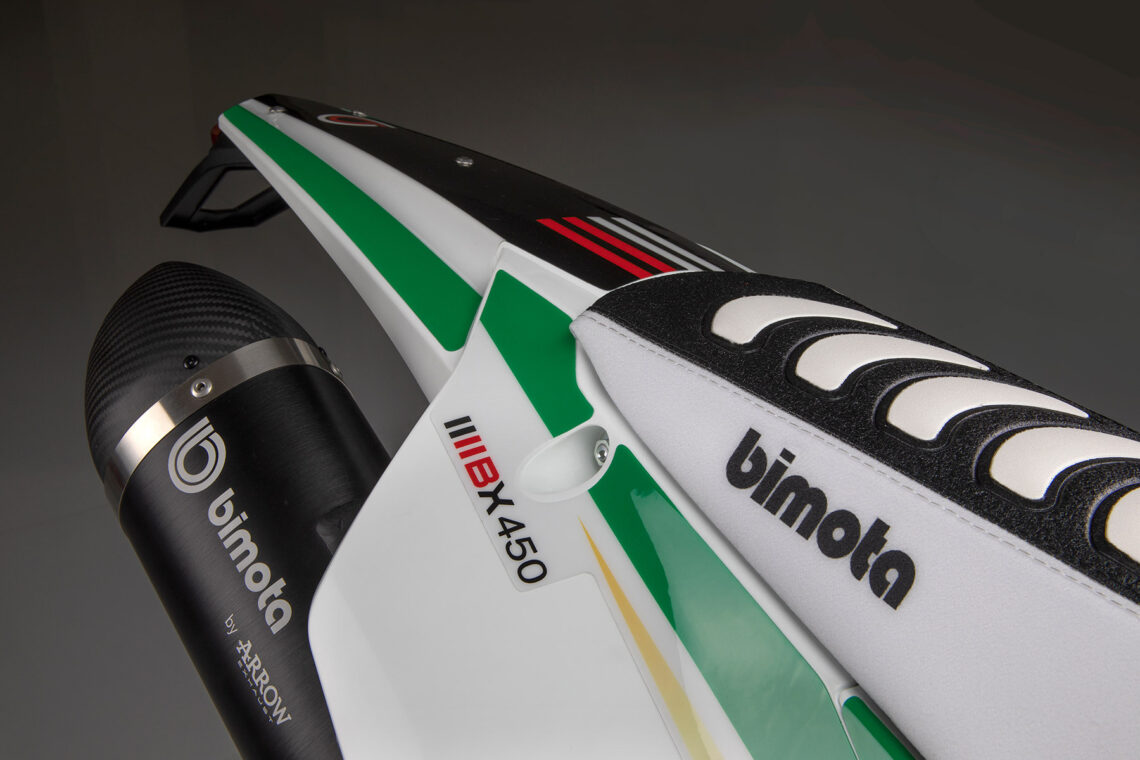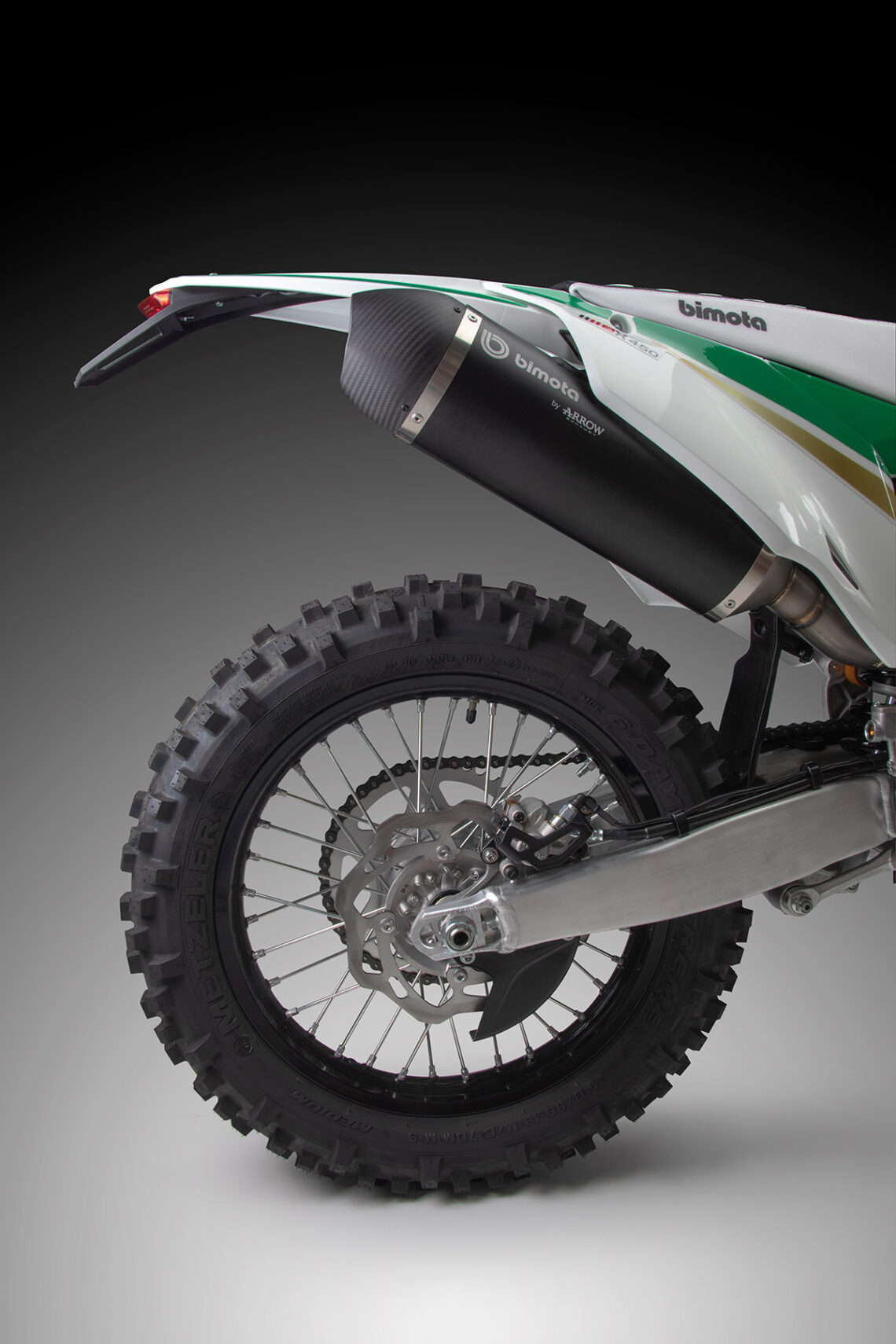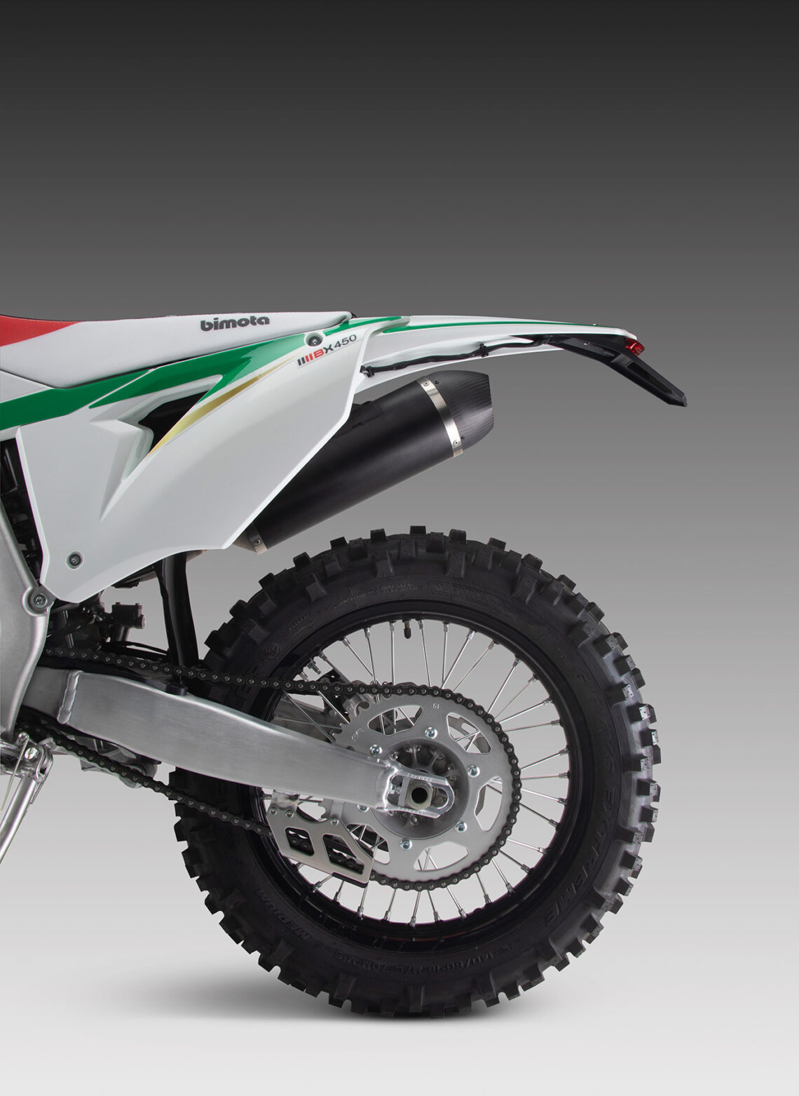 Otro cambio que trae la Bimota BX450 respecto a la Kawasaki KX450X está en los neumáticos, trayendo los Metzeler Six Days. La altura del asiento asciende hasta los 850 mm, con una distancia libre al suelo de 335 mm y una distancia entre ejes de 1485 mm.
