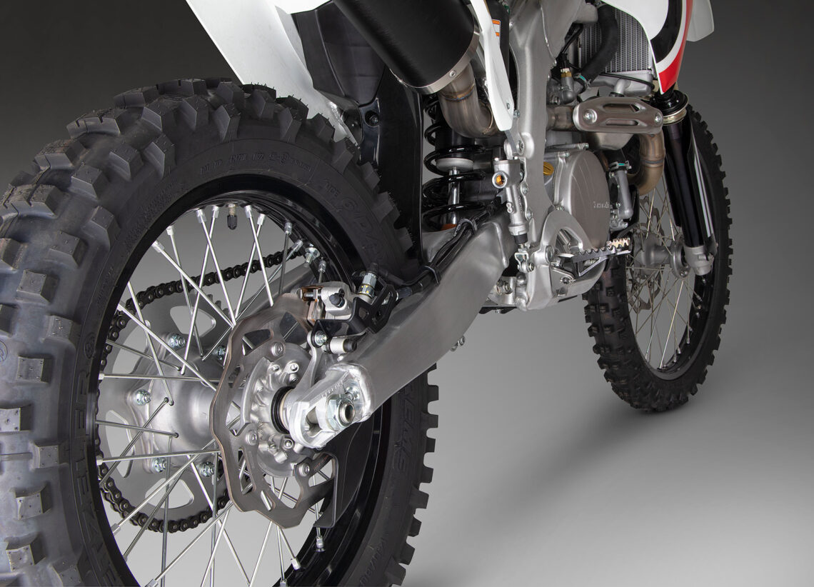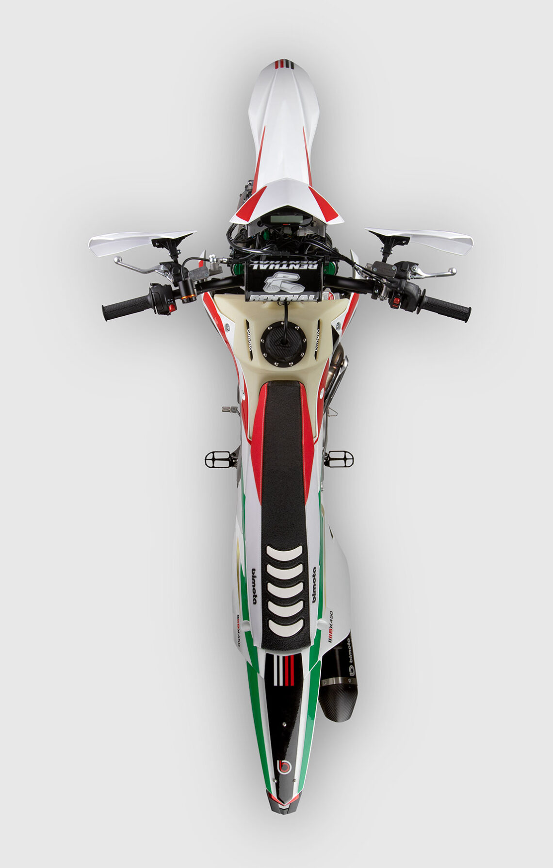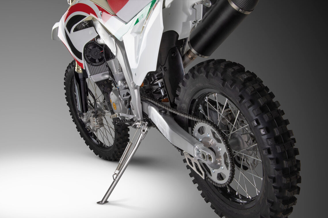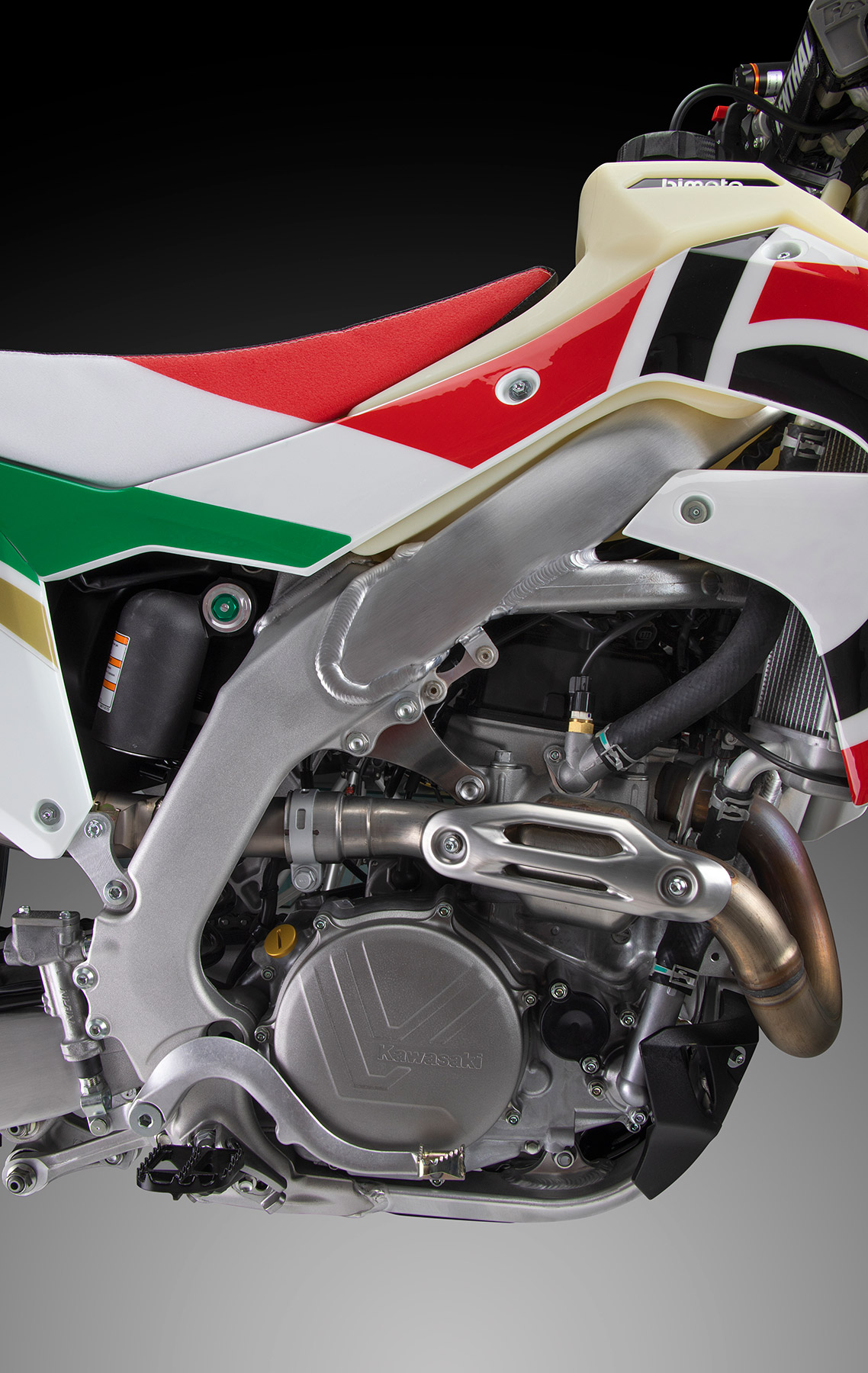 Otro cambio que trae la Bimota BX450 respecto a la Kawasaki KX450X está en los neumáticos, trayendo los Metzeler Six Days. La altura del asiento asciende hasta los 850 mm, con una distancia libre al suelo de 335 mm y una distancia entre ejes de 1485 mm.