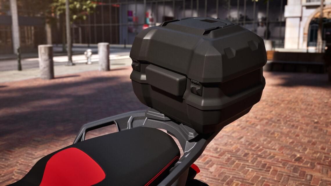Aún podemos aumentar estos números sumando el extra del nuevo nuevo baúl de 43,5 litros (13, 5 litros más y 10 kg de carga, antes 5 kg), con iluminación interior y un puerto de carga USB. Se le puede añadir un respaldo acolchado para el acompañante y paneles laterales pintados en el color de la carrocería. El top-case se fija mediante una rejilla portaequipajes antivibraciones. También se pueden añadir otros accesorios originales como protectores de carrocería y protectores de manos.