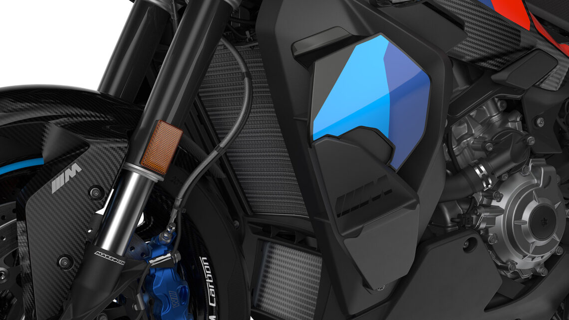 Por supuesto, la BMW M 1000 XR trae un trabajo aerodinámico espectacular, un elemento clave en el desarrollo. Vemos unos aletines en la zona de los paneles laterales delanteros para conseguir mayor estabilidad a altas velocidades. Para que nos hagamos una idea, a unos 100 km/h, ya consigue un aumento de la carga en las ruedas delanteras. Esta carga aumenta en unos 12 kg a 220 km/h.