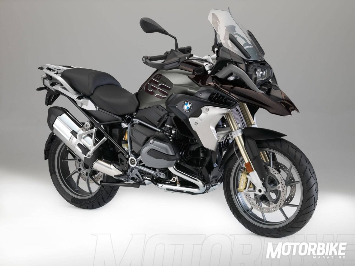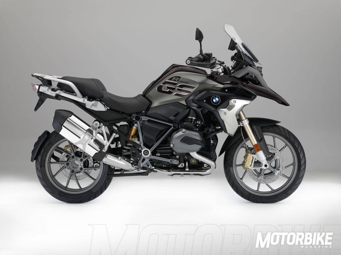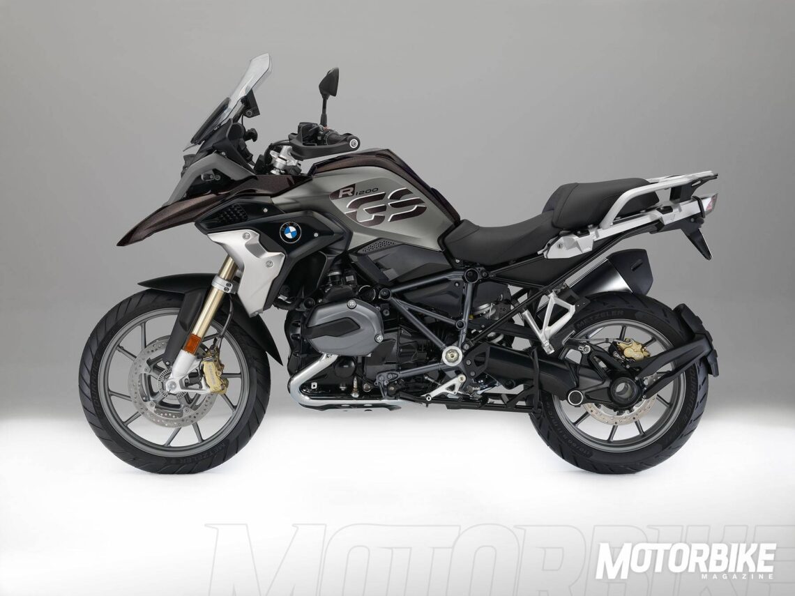 - Por otro lado, la BMW R 1200 GS Exclusive se caracteriza por unos paneles laterales en mate, otros elementos decorativos, una aleta protectora en la rueda delantera, un cubre depósito en color chocolate metálico y chasis en gris mate, gran contraste con el negro de la transmisión y el dorado de las pinzas.