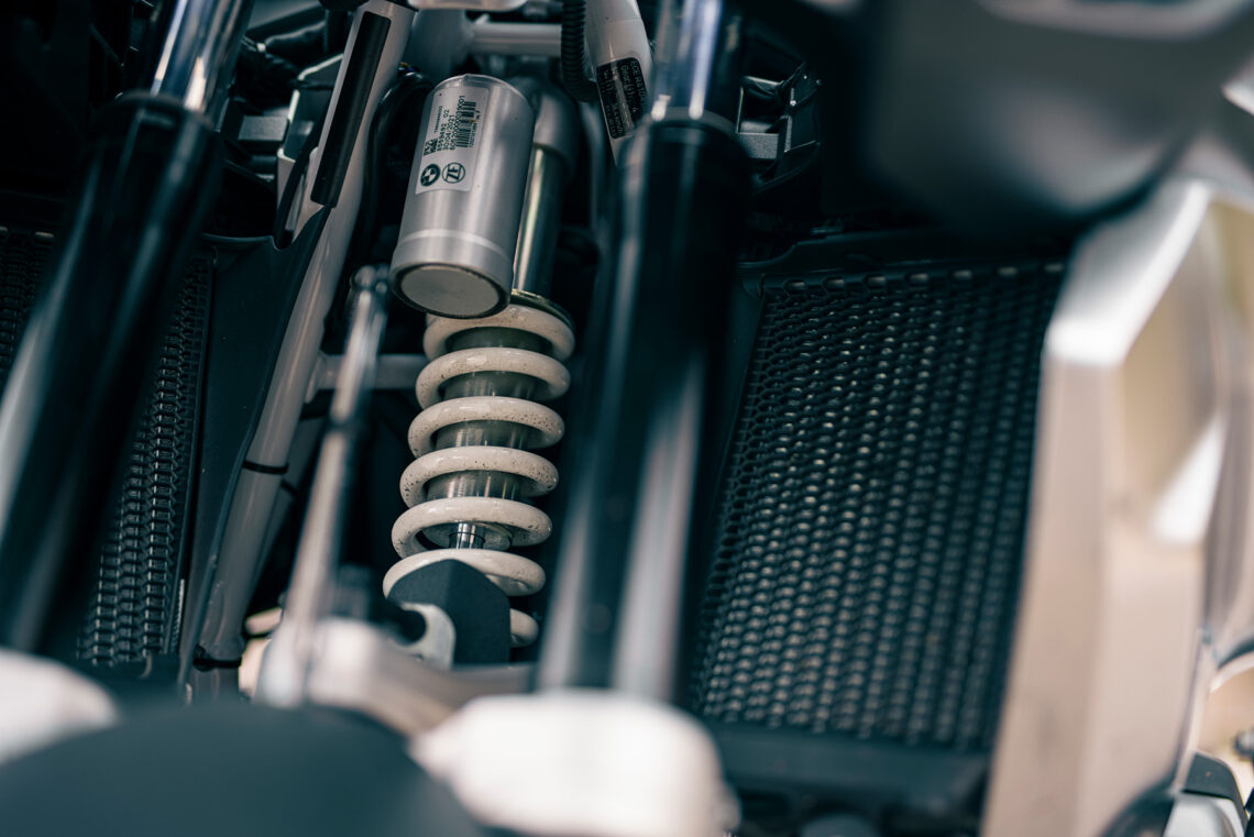 Basculante monobrazo de aluminio fundido con BMW Motorrad Paralever, amortiguador WAD, precarga regulable hidráulicamente (continuamente variable), amortiguación de rebote ajustable mediante mando manual