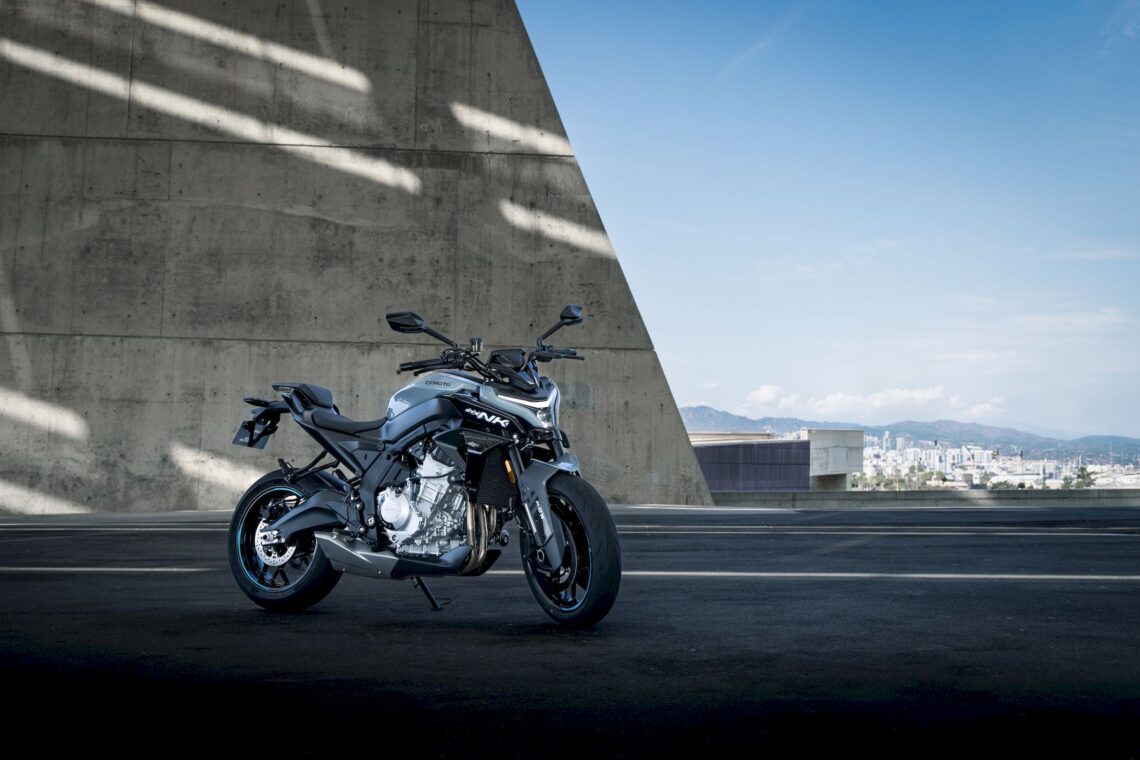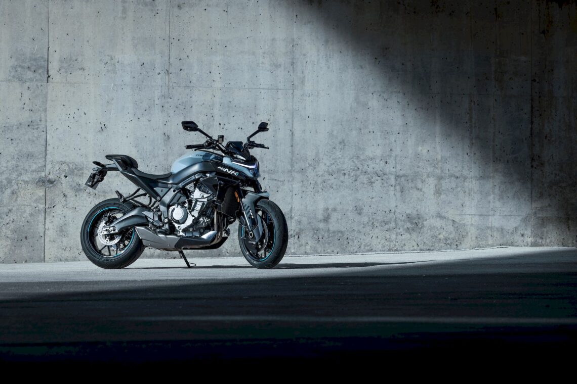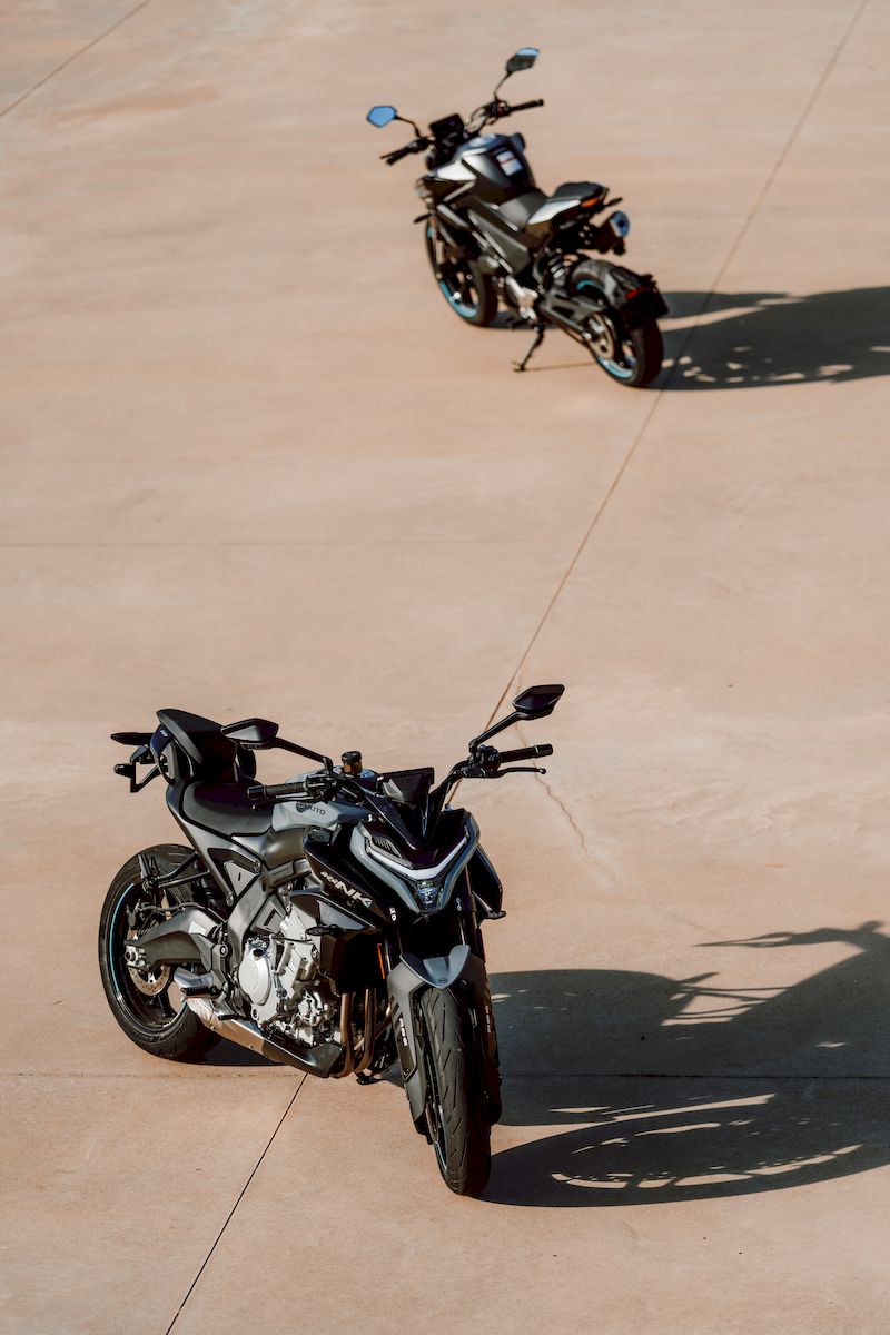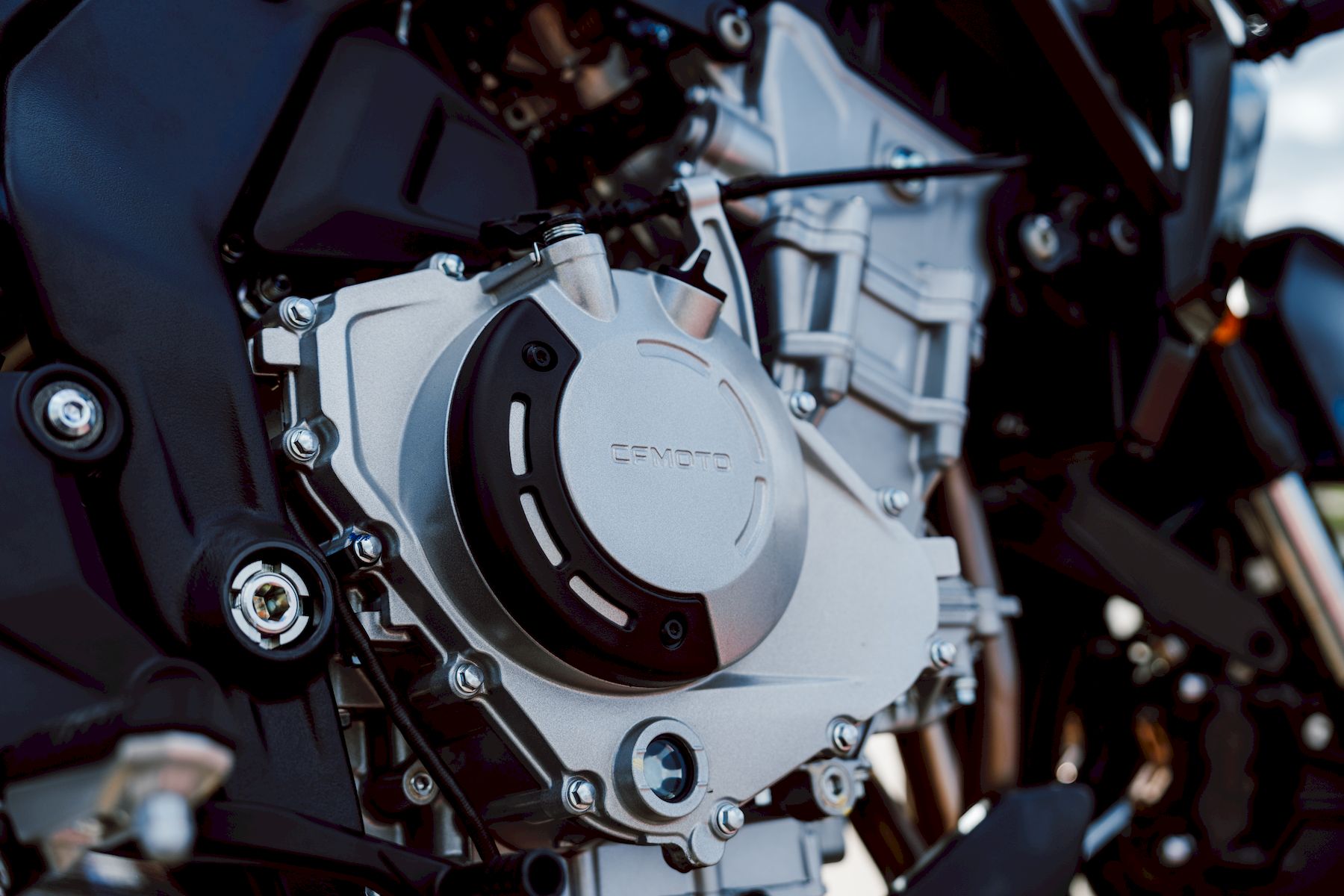 La CFMOTO 675NK está impulsada por una mecánica tricilíndrica en línea DOHC 12 válvulas Euro 5+ que declara 88.5 CV a 11.000 rpm, 68 Nm a 8.250 rpm (fuera del mercado europeo las cifras ascienden a 94 CV y 70 Nm) con embrague antirrebote y cambio semiautomático sólo para subir marchas. La electrónica es sencilla, sin IMU ni acelerador RbW, e incluye control de tracción (2 niveles de intervención, desconectable) y ABS.