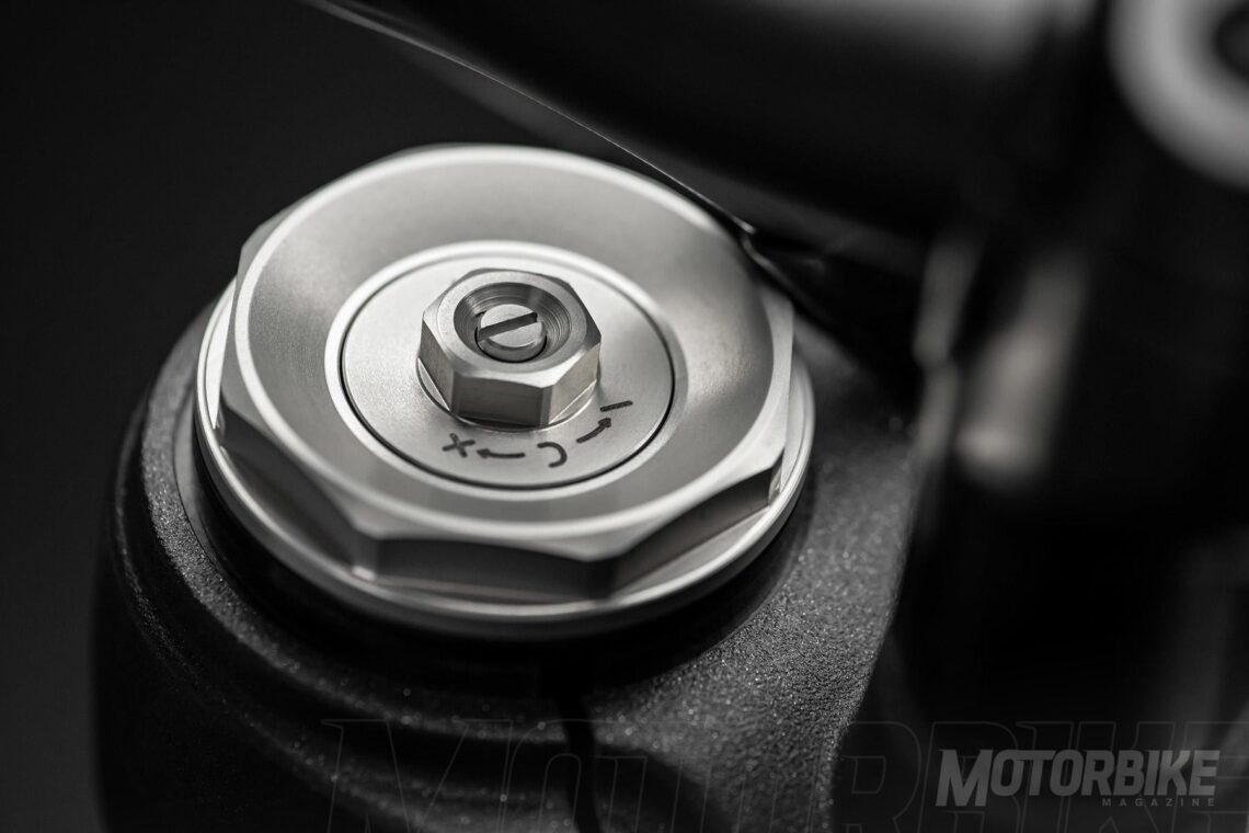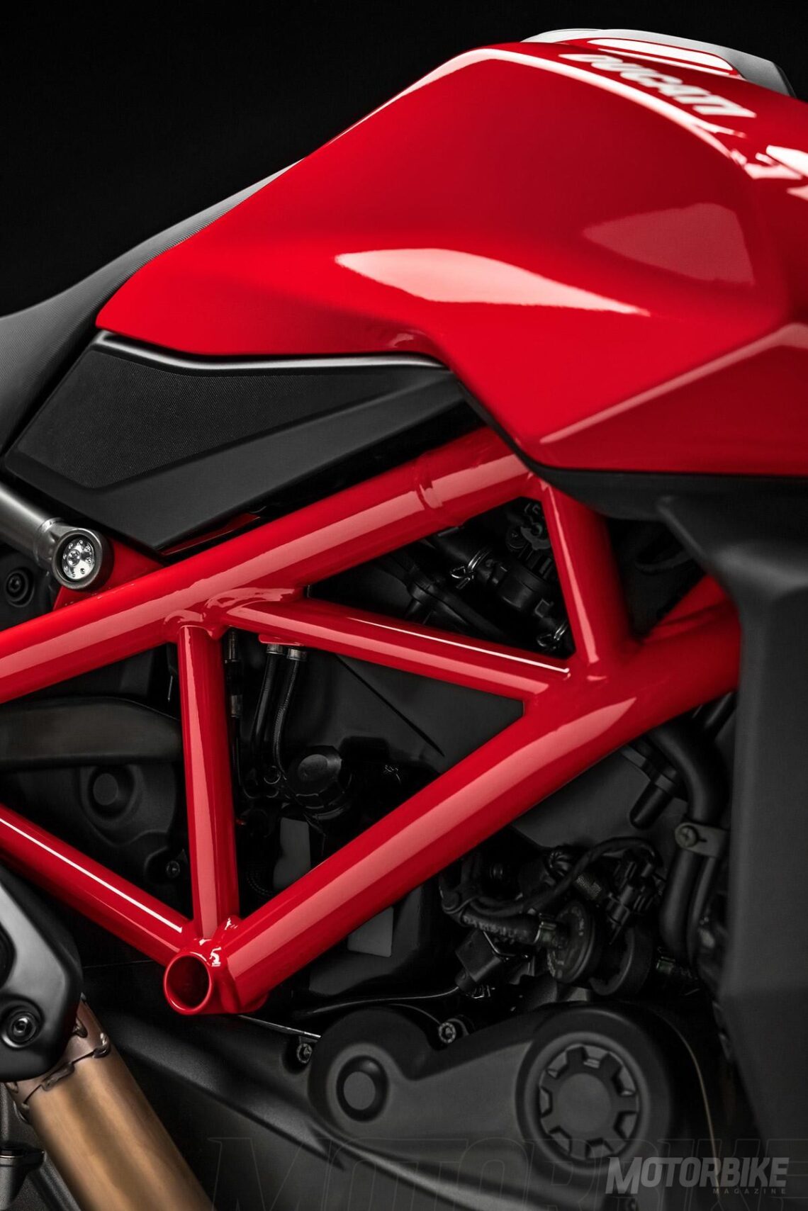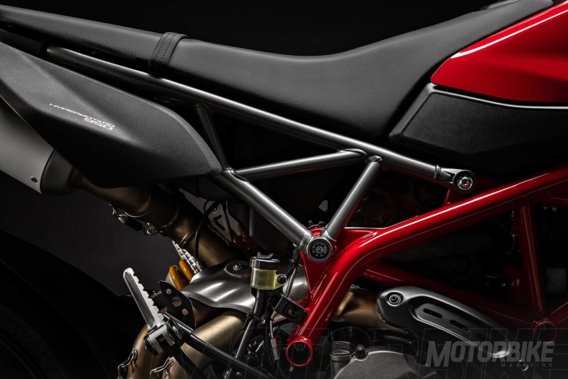 La Ducati Hypermotard 950 2019 es más ligera, más concretamente 4kg menos, que se han ganado gracias a una reducción de material en el subchasis y a un nuevo diseño del chasis principal. El motor también es 1,5kg más ligero. Horquillas Marzocchi más ligeras, almas de disco de freno en aluminio y botellas de aluminio también contribuyen a esta reducción. El peso final en vacio es 200kg.