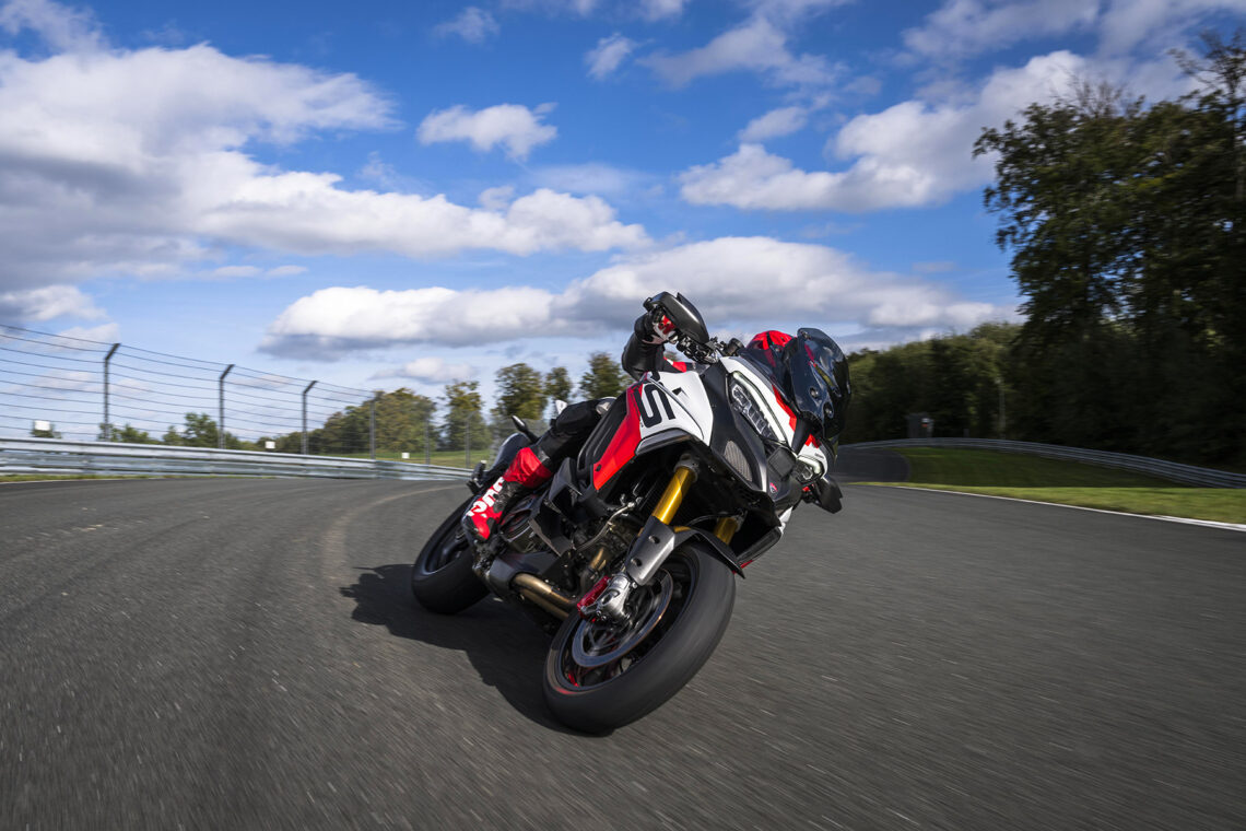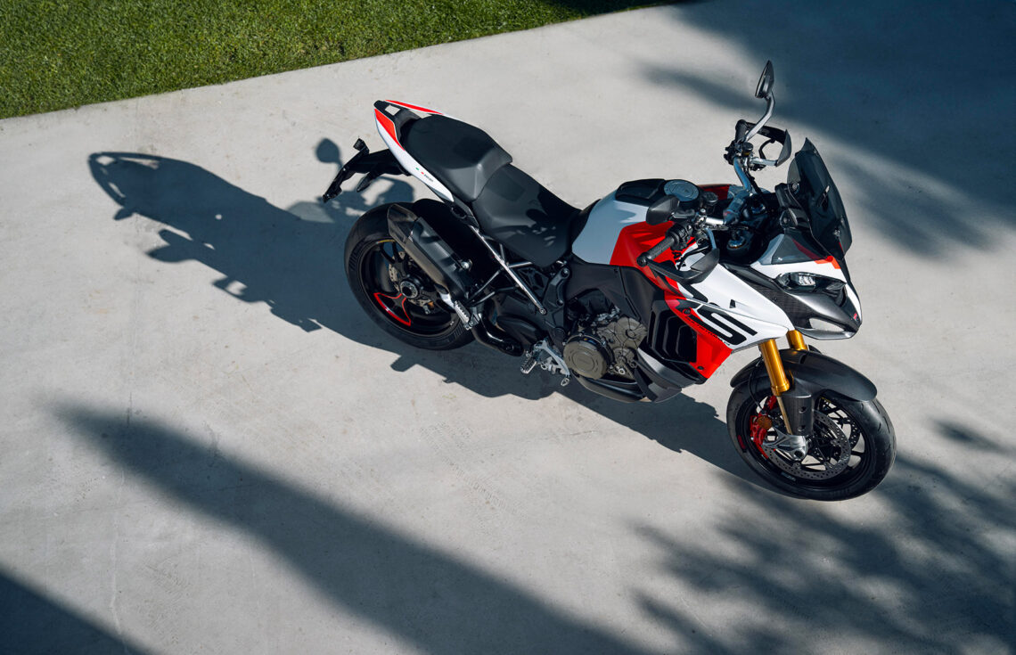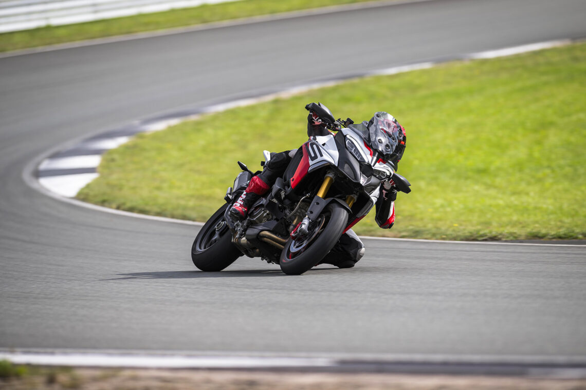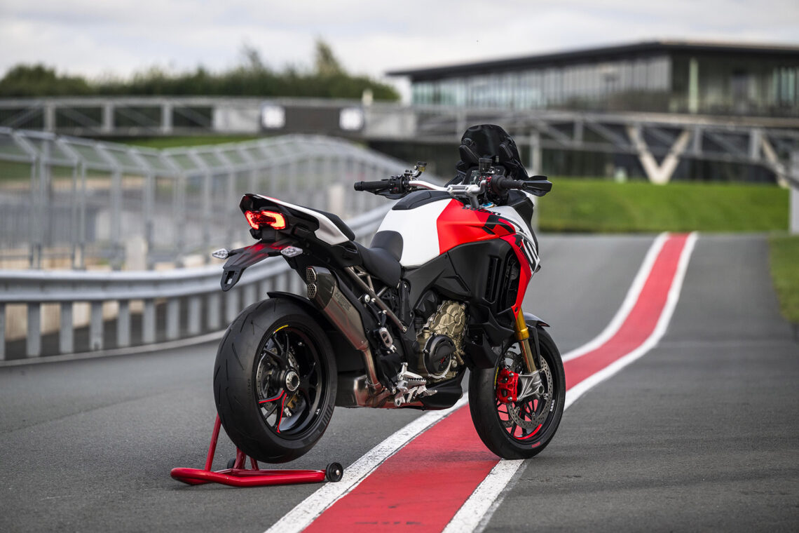 En los frenos, también vemos crema derivada de la Panigale V4. Delante monta discos de 330 mm y pinzas monobloque Brembo Stylema como en la MTS V4 S, pero con las pastillas de la Panigale. Atrás tiene un disco de 265 mm con una pinza flotante Brembo. El control, de cinemática regresiva, dispone de un pequeño elemento de bombeo, mejorando así la potencia y modulación. Todo está asistido por un ABS en curva Bosch-Brembo 10.3ME.