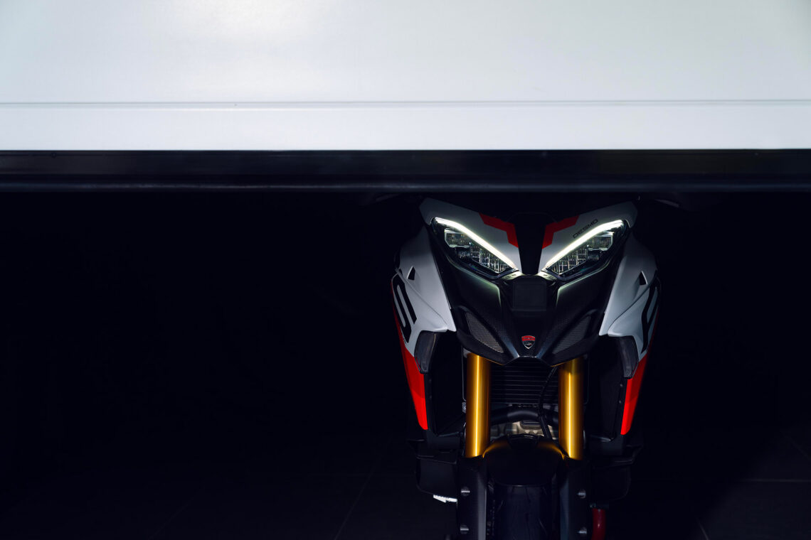 Otros detalles deportivos los vemos en los nuevos gráficos del tablero, con una funcionalidad parecida la Infomode Track de la Panigale V4 y Streetfighter V4. La intervención del control de tracción y el control de wheelie se indican mediante el parpadeo del correspondiente elemento desplegable y la iluminación de la esquina superior derecha del tablero. La pantalla TFT de 6,5" luce unos gráficos exclusivos y se puede visualizar el navegador gracias a la vinculación de la app Ducati Connect que te permite reflejar tu móvil. Para soportar esta funcionalidad, el compartimento del móvil tiene ventilación para enfriar el móvil.