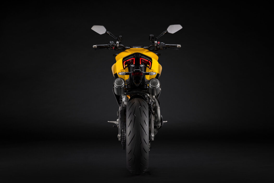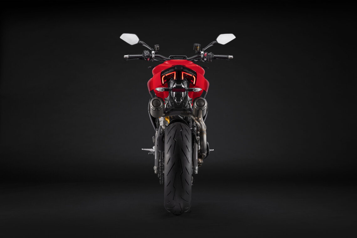 En la parte trasera sigue una continuidad que viene desde delante como en la Panigale. El piloto trasero está dividido en dos partes, como es tradición en la marca, con una forma en arco. Los intermitentes son LED. El escape tiene una doble salida bajo el asiento, algo que también marca su imagen.