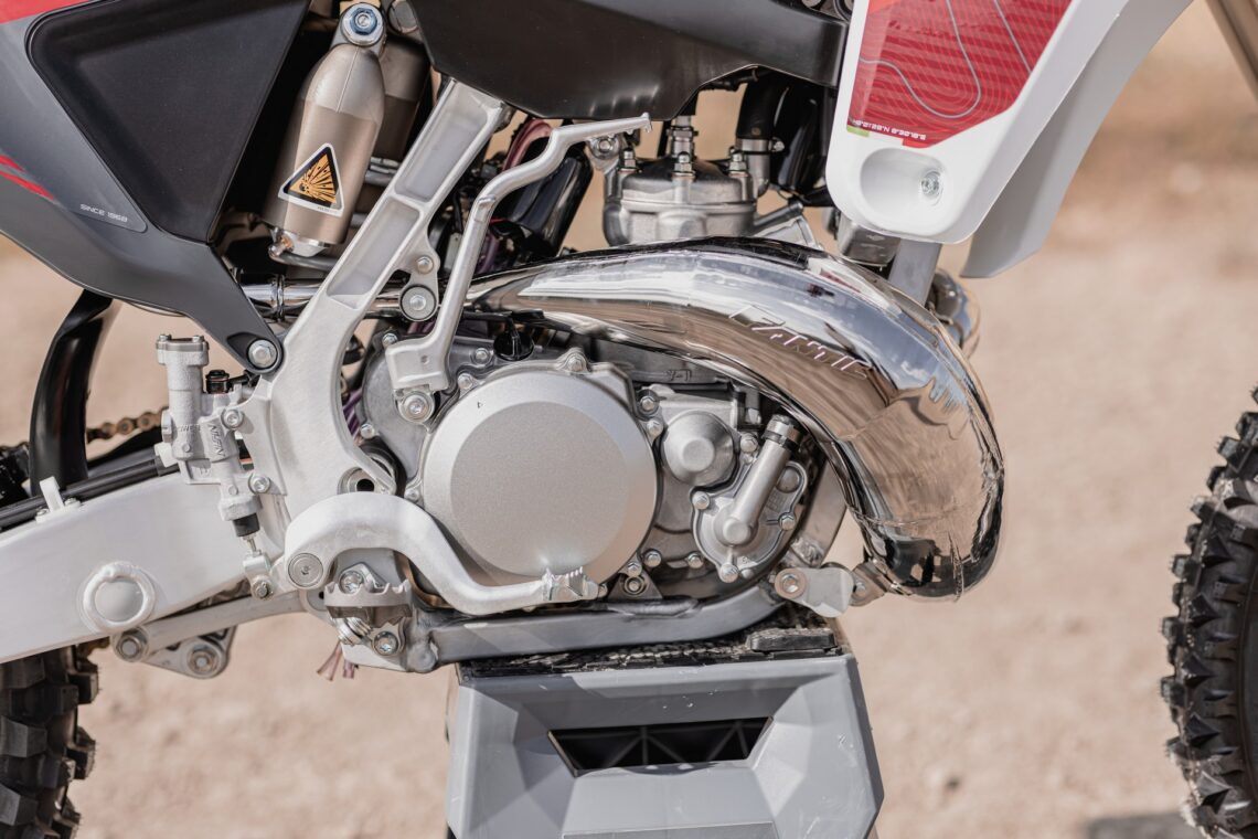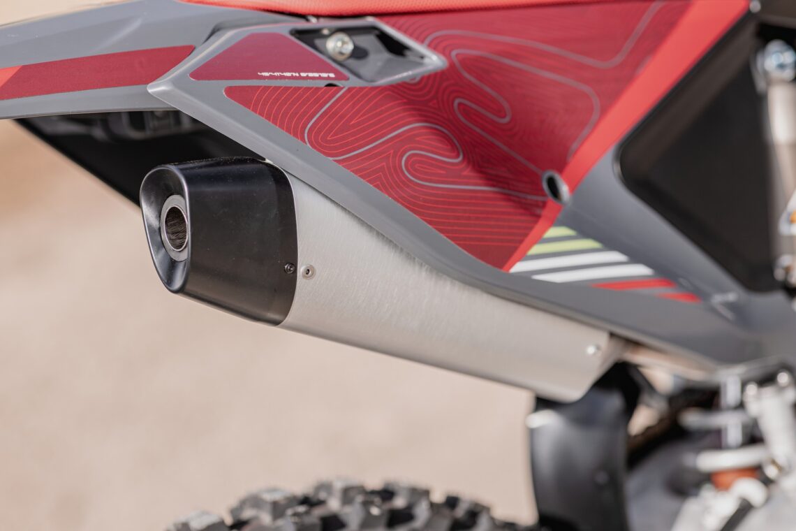 El eje trasero se ha rediseñado con un nuevo airbox con acceso lateral del filtro (sin herramientas y más rápido que nunca). El tamaño se ha regido después de cuidadosos análisis y pruebas realizadas con pilotos oficiales. También buscando minimizar la entrada de impurezas y así asegurar un aire totalmente limpio.