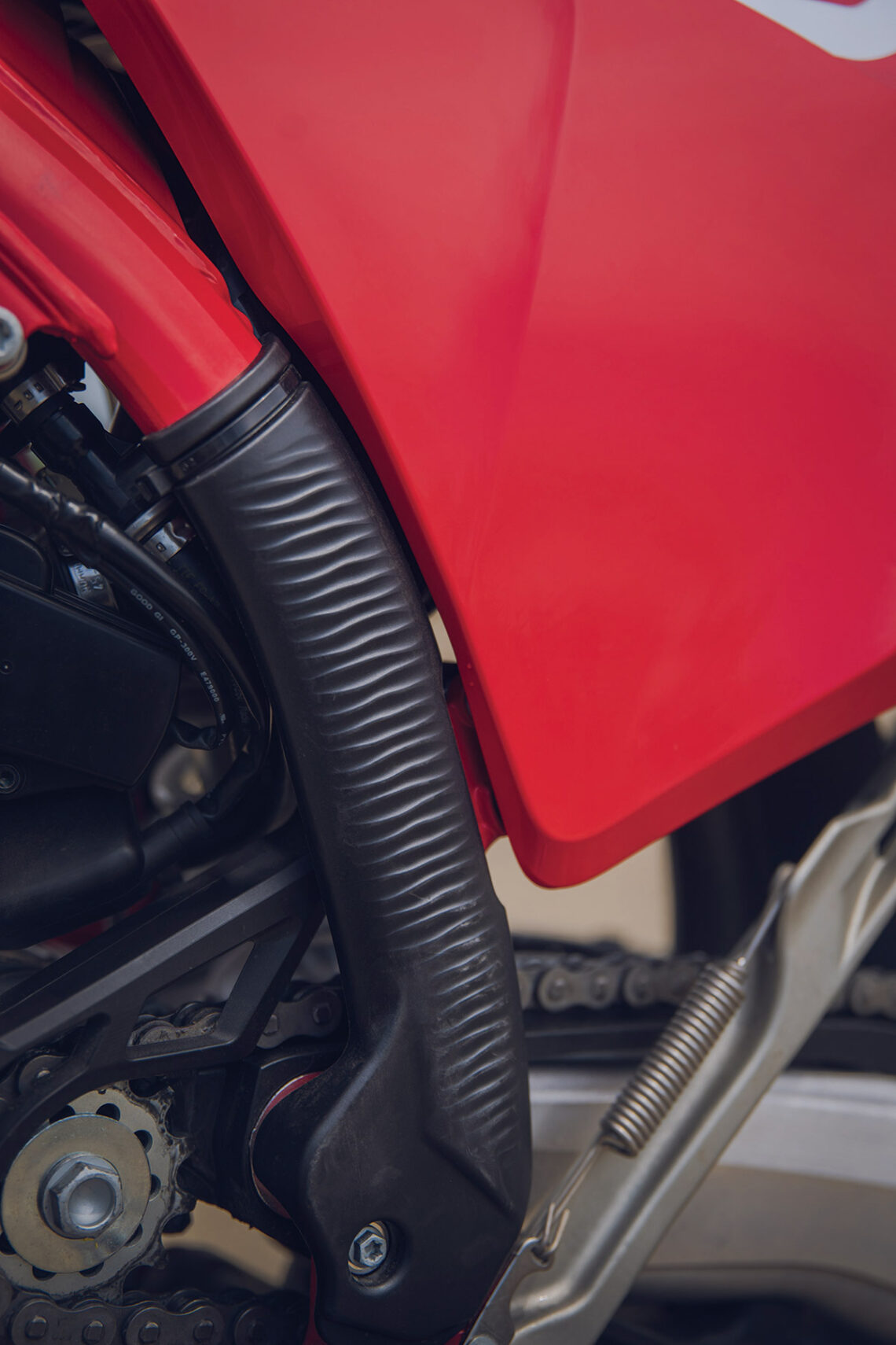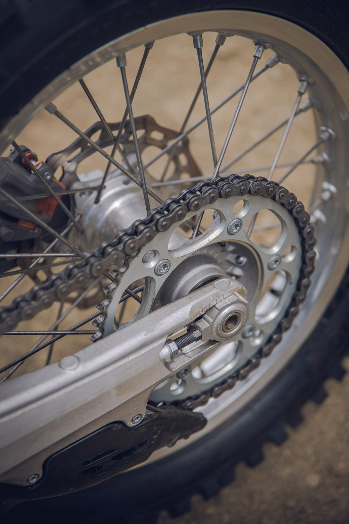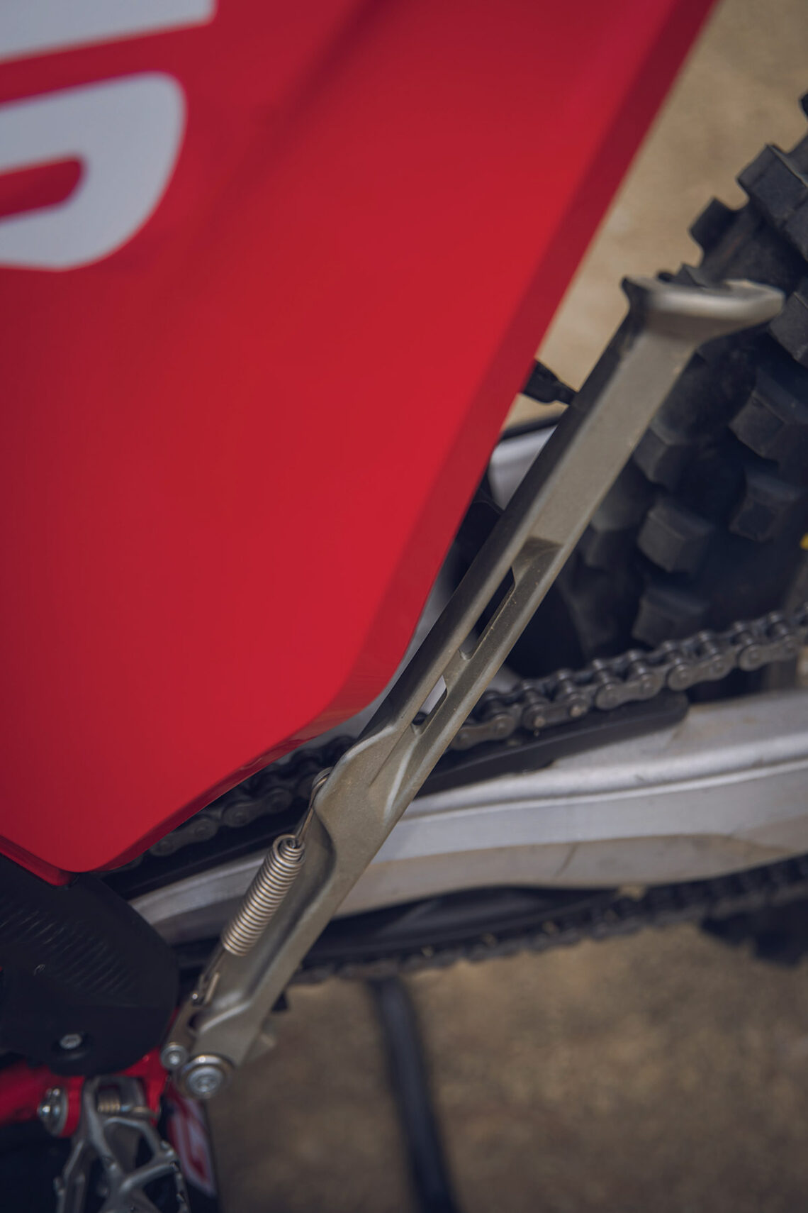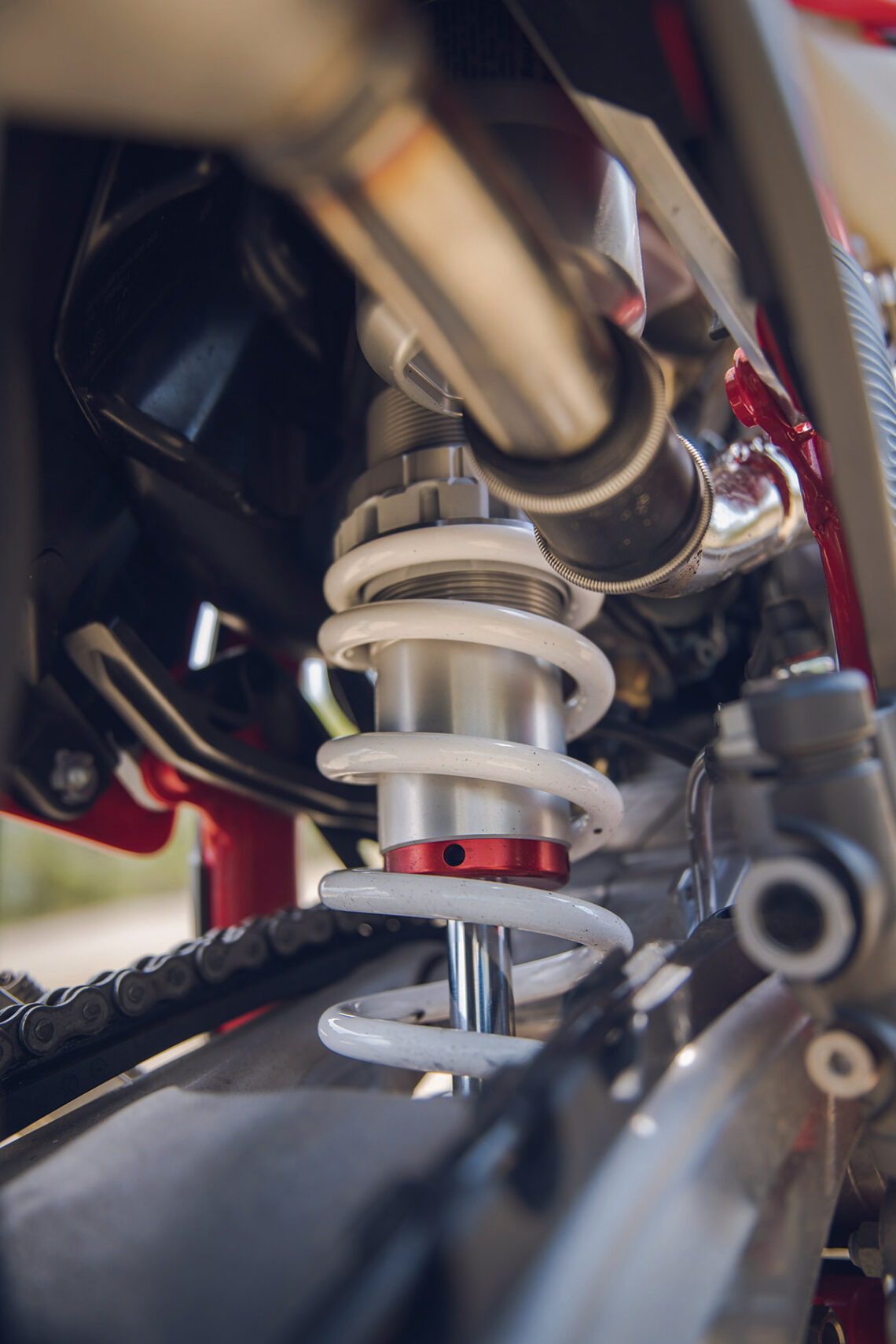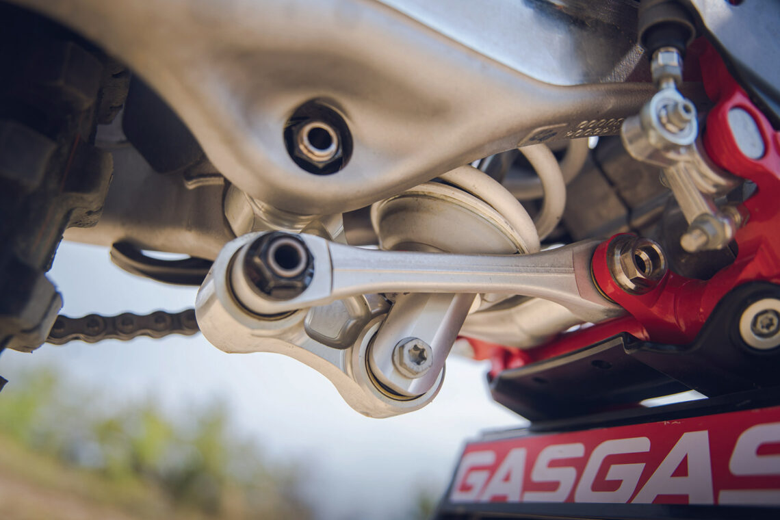 - Amortiguador trasero WP XACT con sistema de bieletas - Más corto y ligero, pero con 300 mm de recorrido, el amortiguador WP XACT incorpora un nuevo pistón para mejorar el confort. Y para que la acción del amortiguador sea siempre consistente y progresiva, todas las motos GASGAS de enduro están equipadas con un sistema de bieletas.