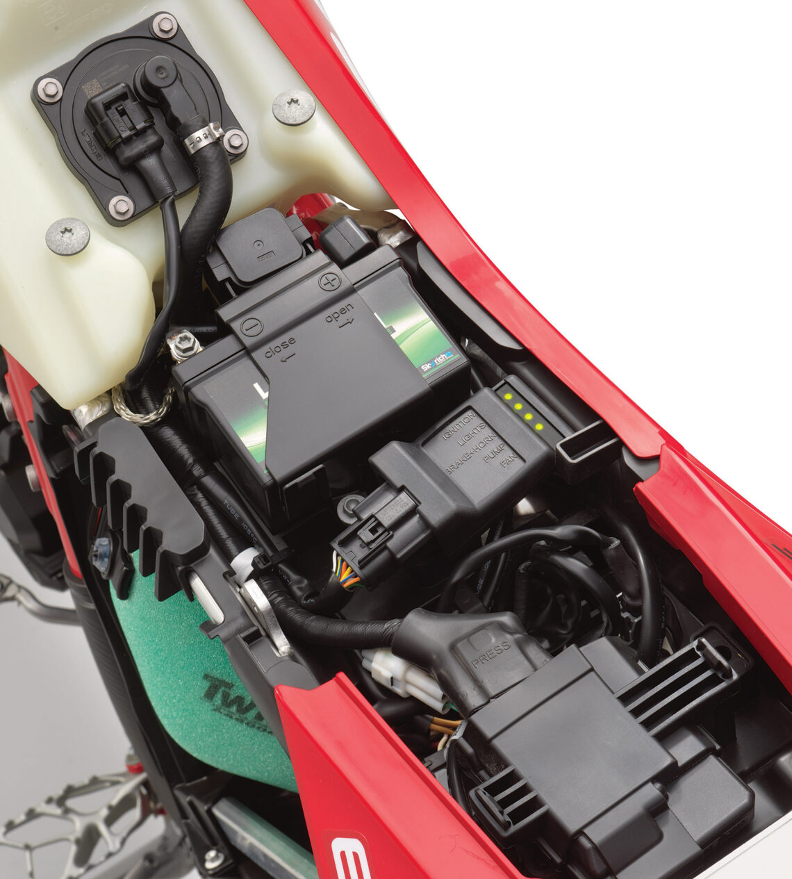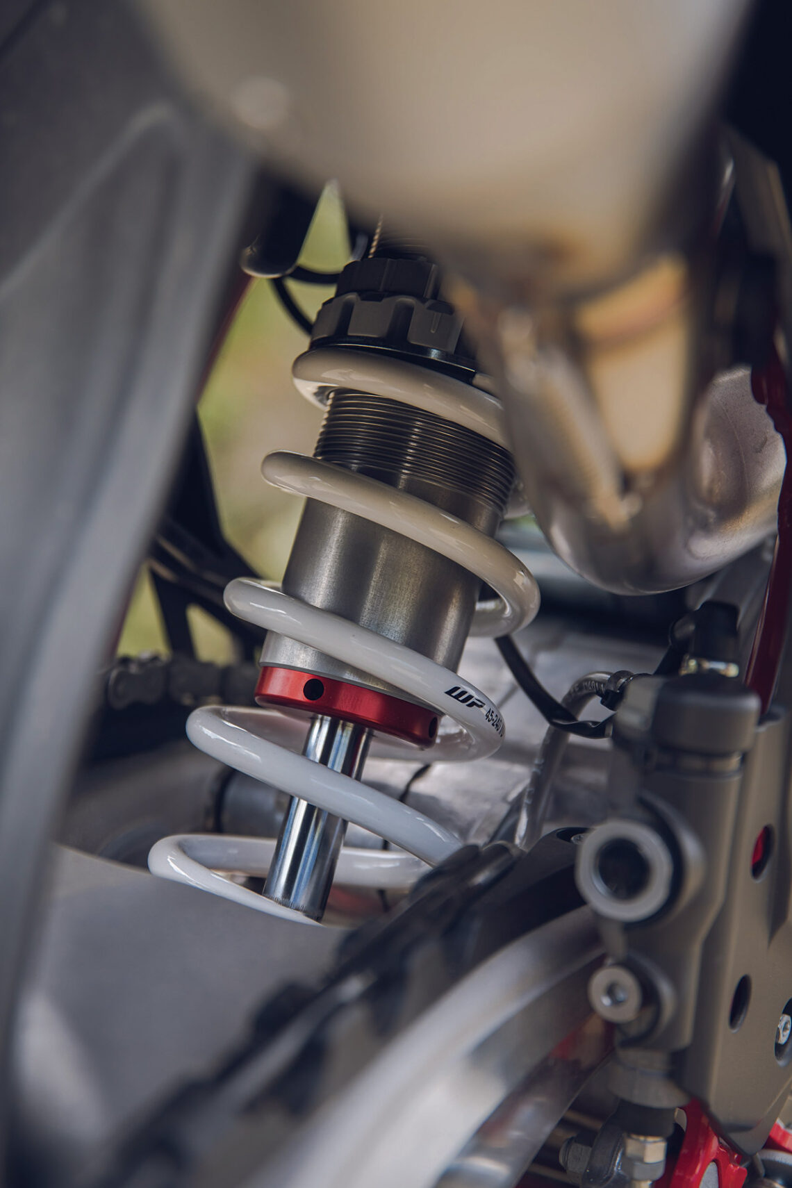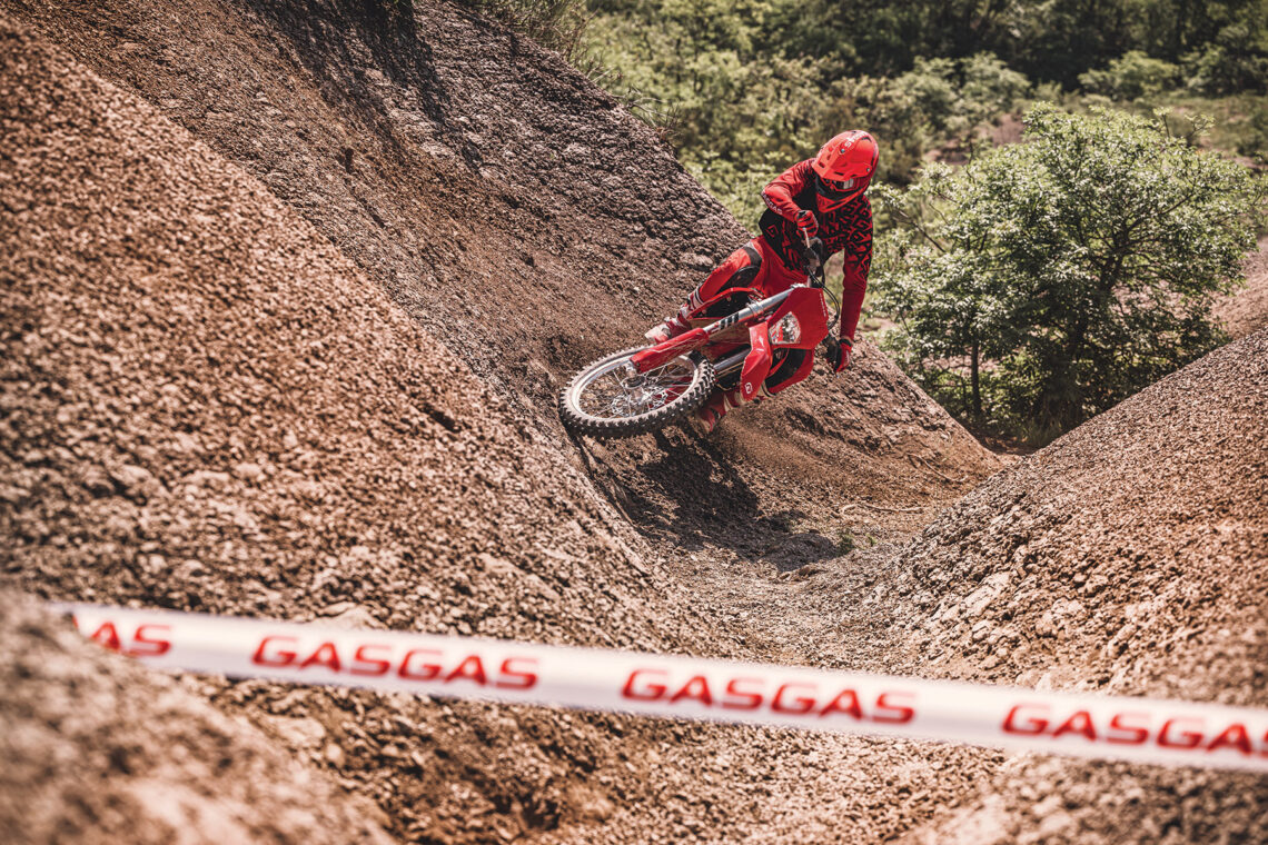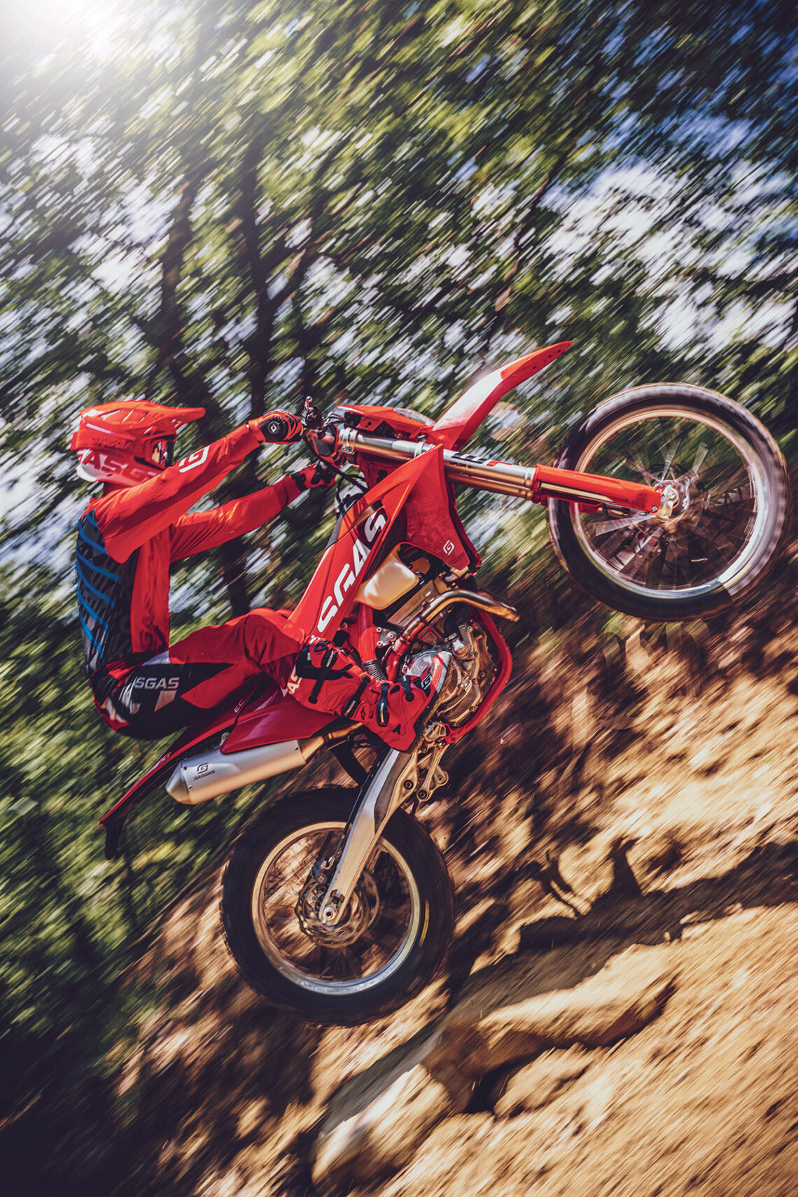 - Amortiguador trasero WP XACT con sistema de bieletas - Más corto y ligero, pero con 300 mm de recorrido, el amortiguador WP XACT incorpora un nuevo pistón para mejorar el confort. Y para que la acción del amortiguador sea siempre consistente y progresiva, todas las motos GASGAS de enduro están equipadas con un sistema de bieletas.