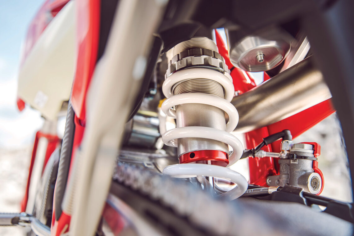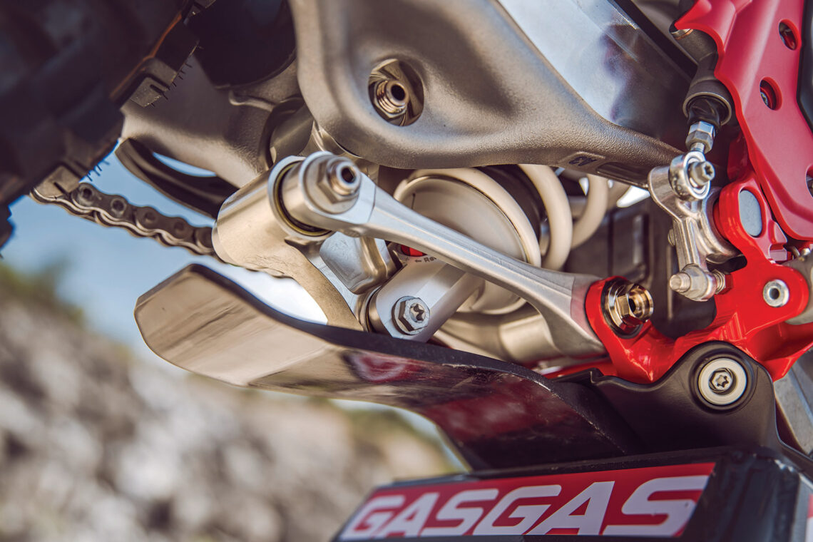 - Amortiguador trasero WP XACT con sistema de bieletas trasero - Ajustes actualizados con mejor rendimiento progresivo.