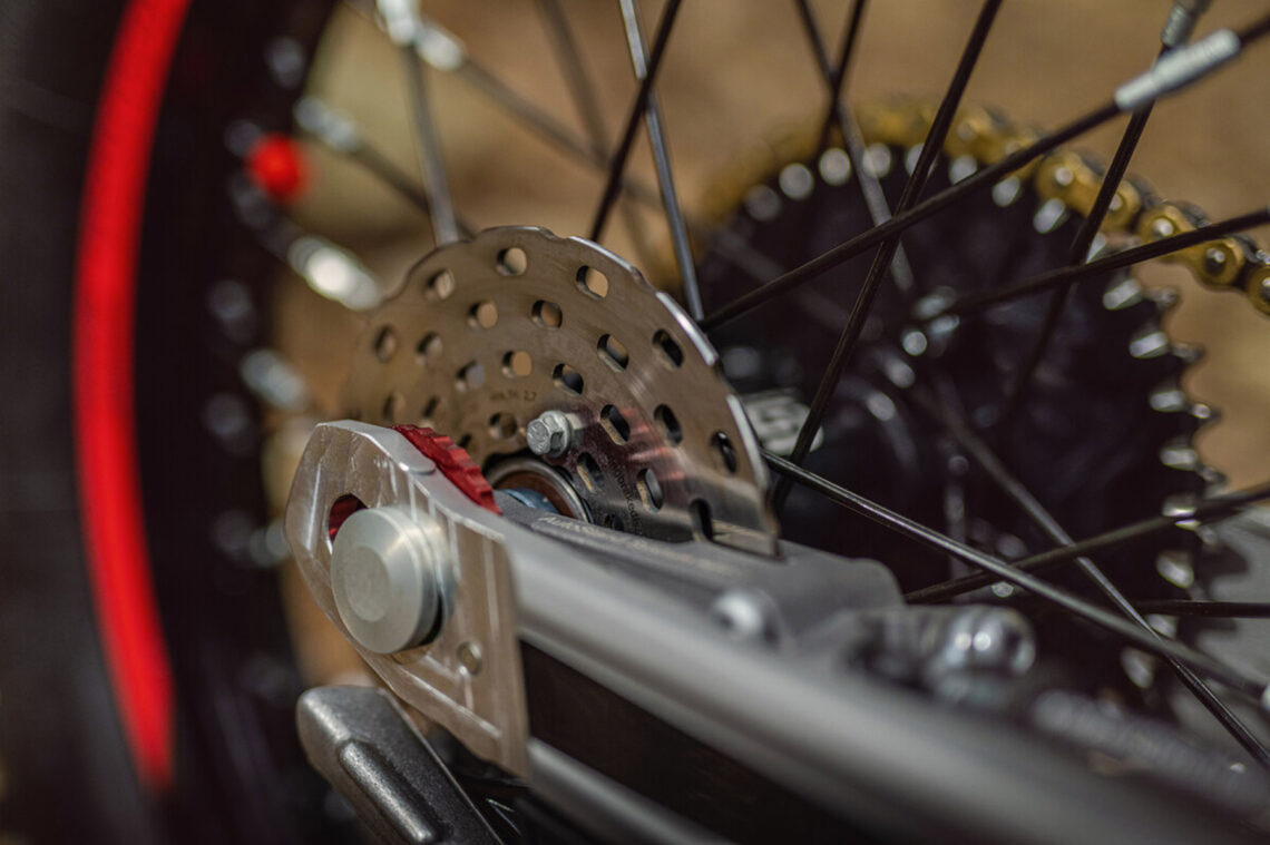 - Llantas resistentes y ligeras con bujes mecanizados y una llanta trasera ligera.