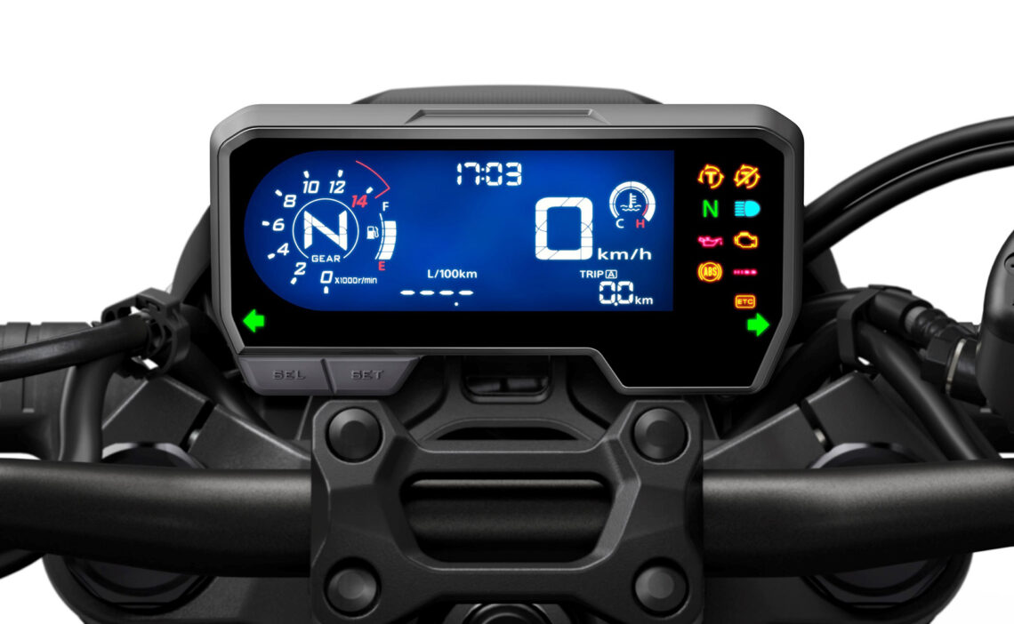 | Instrumentos | Velocímetro digital, tacómetro de barras digital, dos contadores parciales, reloj digital de gasolina de gráfico de barra, indicador de subir marcha y posición del cambio, reloj horario digital |