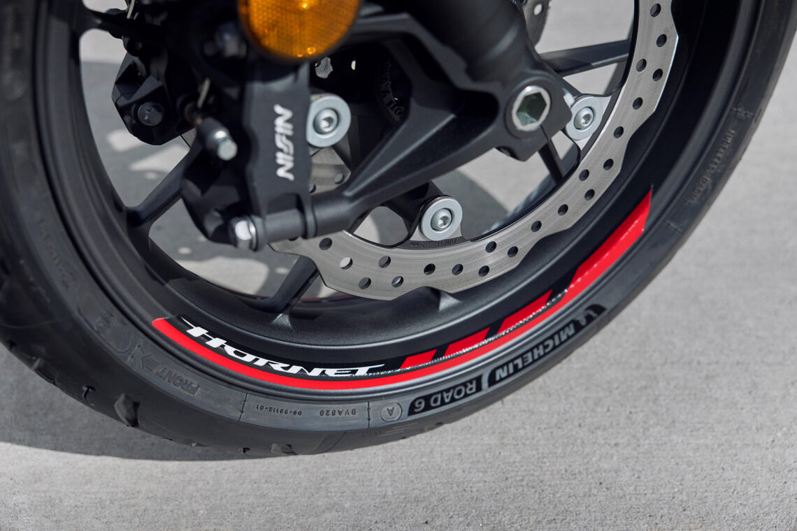 El bastidor de acero tipo diamante, que pesa solo 16,6 kg, mantiene la Hornet ligera y manejable. La suspensión, que emplea una horquilla invertida Showa SFF-BP USD de 41 mm en la parte delantera y un amortiguador trasero ajustable en 7 posiciones con sistema Pro-Link, garantiza una conducción ágil y un tacto mejorado en el tren delantero, gracias a los reglajes optimizados. Con discos delanteros de 296 mm y pinzas de cuatro pistones de anclaje radial, la frenada es potente y progresiva, proporcionando el control necesario en cualquier circunstancia