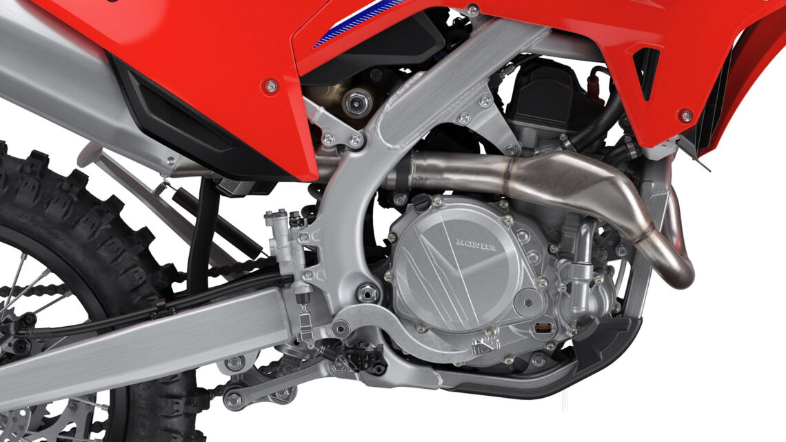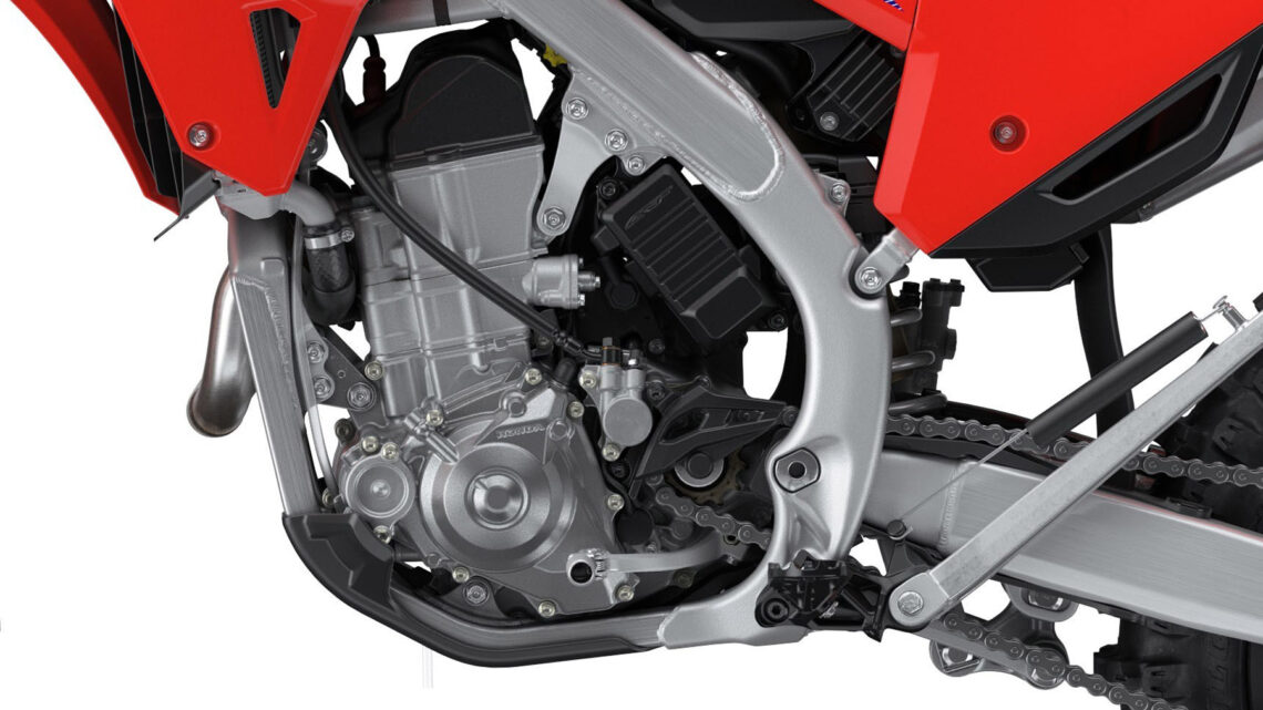 Otro de los cambios de la Honda CRF450RX 2022 es que su motor, con 449,7 cc y que se mantiene intacto, sí que tiene un rendimiento mejorado debido a la nueva programación de la centralita ECU que permite un funcionamiento más fino de bajo a medio régimen, mejorando la actualización del año pasado.