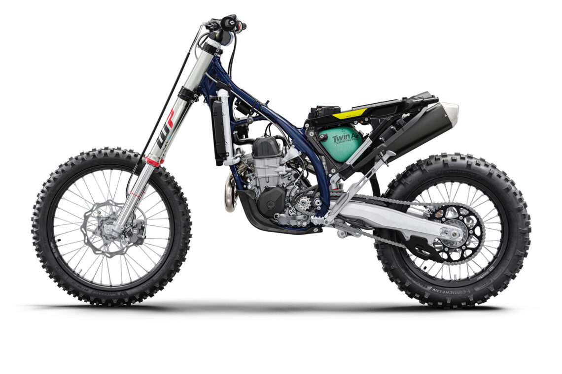 Si empezamos por los avances comunes a toda la gama, hablamos del chasis hidroformado, cortado a láser y con soldadura robotizada, totalmente nuevo para dar con el equilibrio perfecto de rigidez, flexión, estabilidad y absorción de energía. La conexión con la horquilla y las masas rotacionales están reposicionadas mientras que el monoamortiguador ya no se apoya en el tubo principal, mejorando así el comportamiento anti-squat. Se ha revisado también la anchura de las paredes para reforzar la rigidez o la flexibilidad en ciertos puntos. Las estriberas ahora quedan un poco más hacia dentro, más protegidas, pero son nuevas y más grandes diseñadas mediante dinámica de fluidos computacional (CFD). El nuevo retén de sellado permite un montaje más fácil en caso de sustitución o mantenimiento y además el tubo superior está cerrado para evitar que entre agua, polvo o gasolina que desborda del conducto, ahora reconducido. El nuevo bloqueo de la dirección está bajo la triple tija. Los modelos 2T siguen teniendo el depósito de aceite integrado en el chasis y se ha optimizado para adaptarlo al nuevo concepto de chasis. La estructura luce un acabado en color azul metálico mientras que los protectores son nuevos. Las Husky de enduro estrenan también una pata de cabra lateral nueva hecha de una pieza.