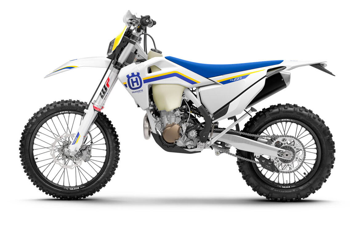 La Husqvarna FE 450 Heritage 2023 es una edición especial que toma como base la Husqvarna FE 450. La diferencia entre ellas son la decoración especial en blanco, amarillo y azul que recuerda a los modelos históricos de la firma, la funda azul del asiento y las llantas Excel anodizadas en negro.
