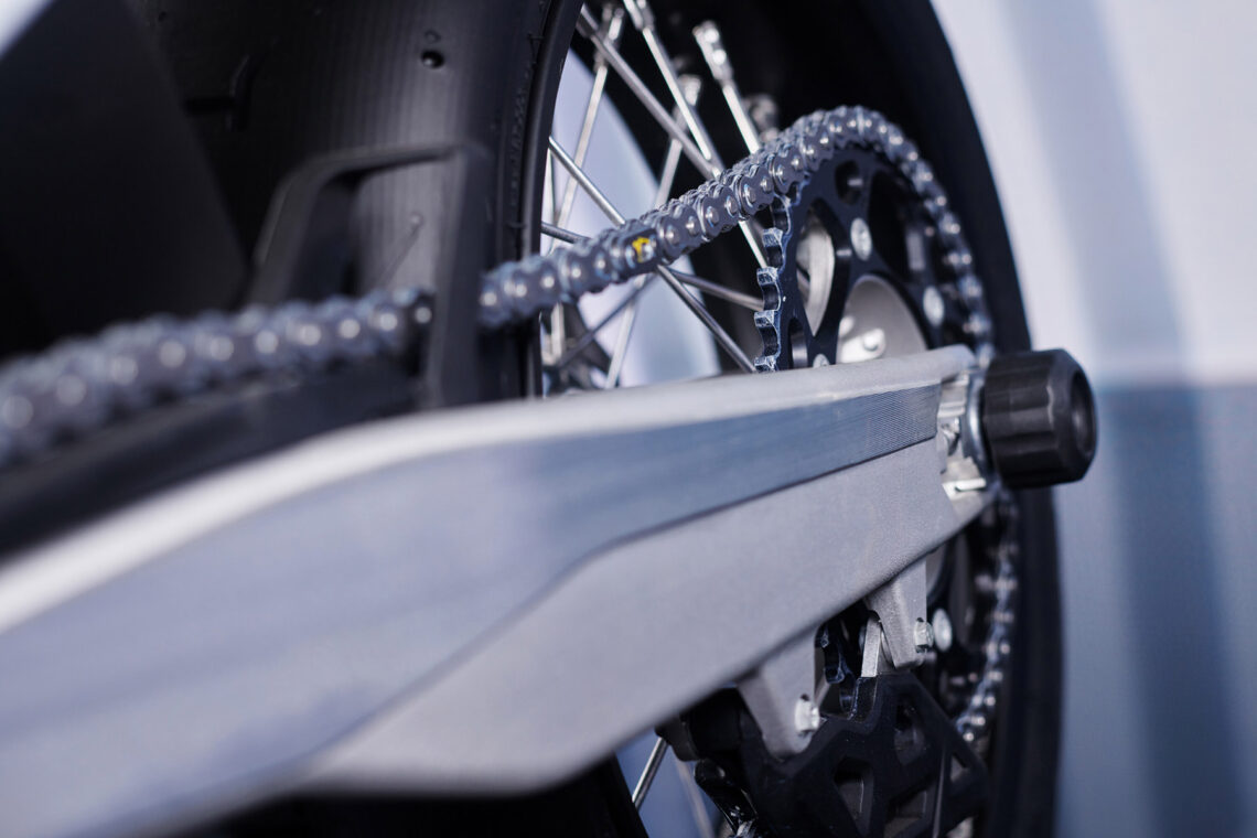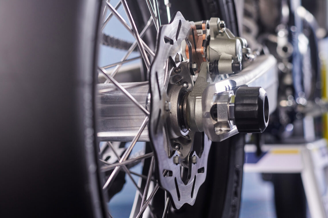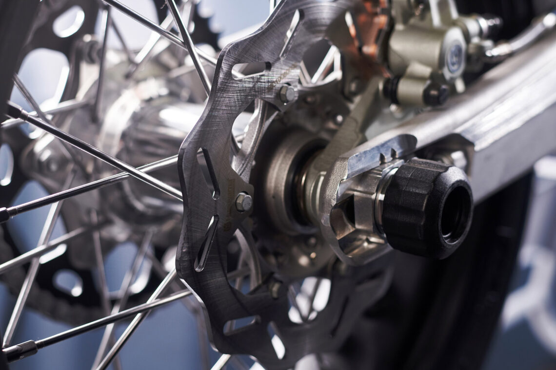 El chasis es de cromo molibdeno hidroformado, con un subchasis trasero de aluminio reforzado con poliamida y suspensiones WP. Además, incorpora otros componentes de calidad como las llantas Alpina, un embrague antirrebotes Suter y unos frenos Brembo de alto rendimiento.