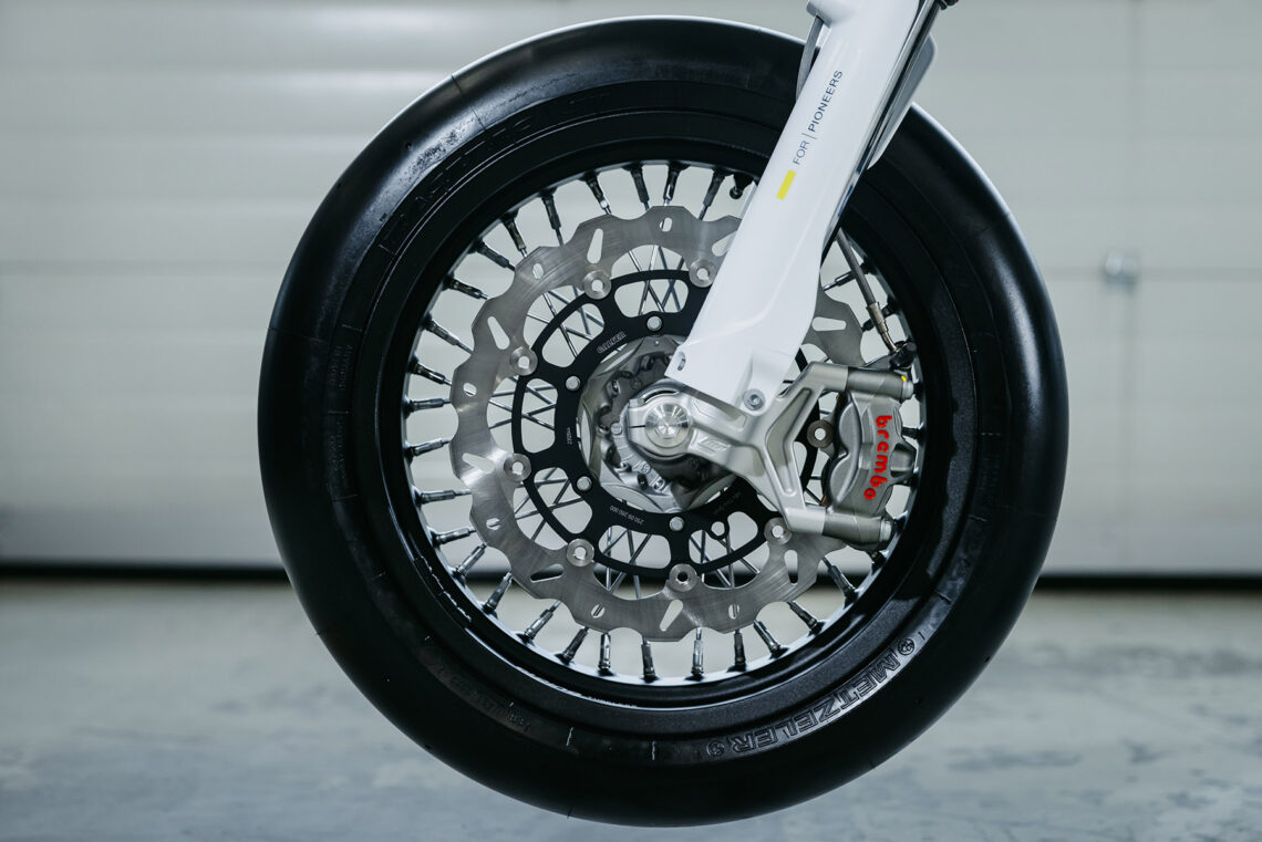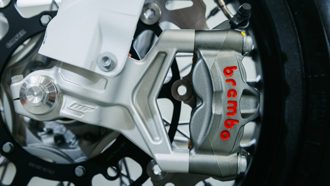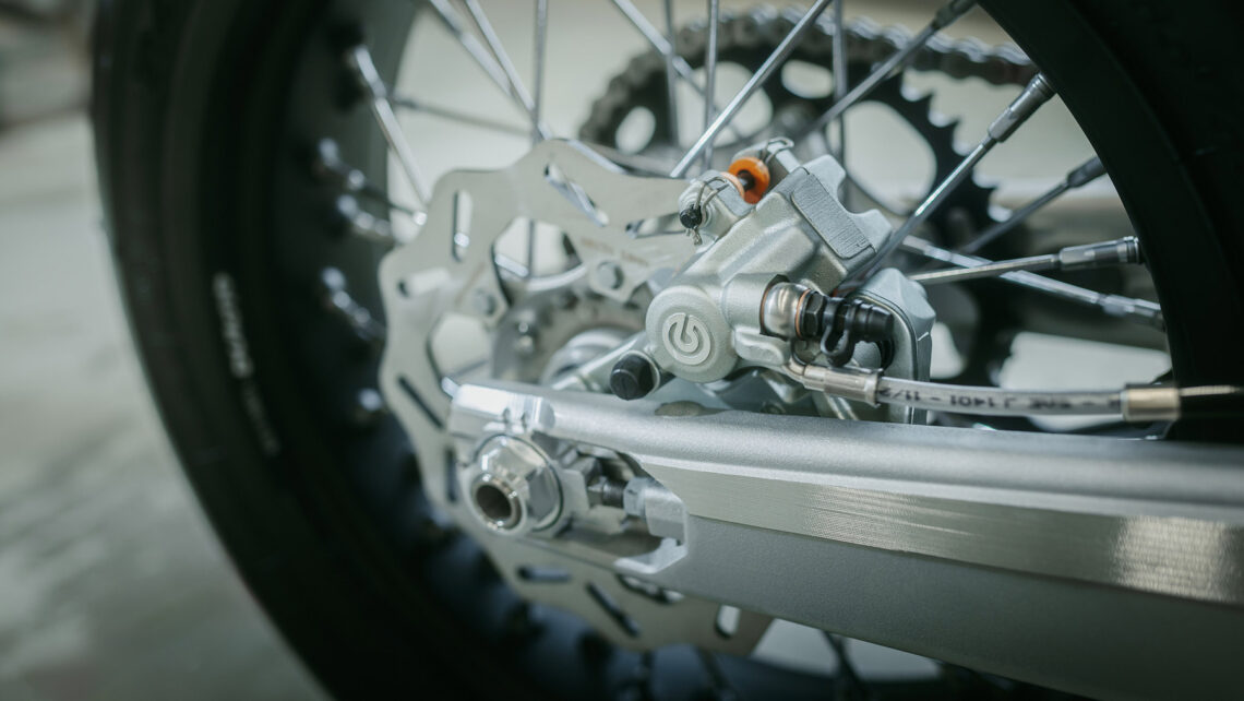 No faltan detalles y componentes de alta calidad que elevan el nivel de esta montura hasta en el último tornillo. Las llantas Alpina están cubiertas con neumáticos Metzeler Racetec SM K1 mientras que en la rueda delantera dispon de un disco de freno de 310 mm fabricado por Braking. Brembo se encarga del sistema hidráulico mientras que el embrague antirrebote es Suter, el manillar ProTaper y los puños ODI.
