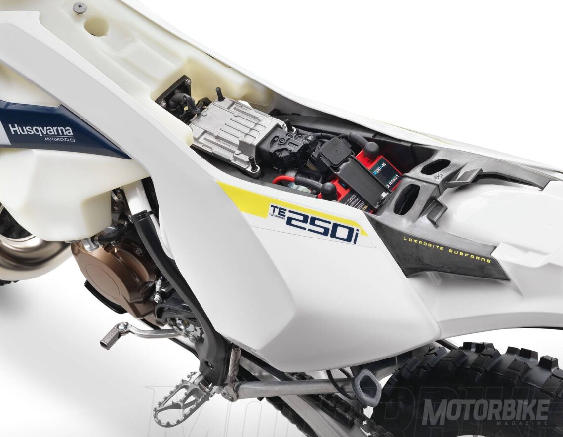 El nuevo sistema de la Husqvarna TE 250i cuenta con los inyectores en los puertos de transferencia y añade la cantidad necesaria para la combustión óptima de cada momento. Cuenta con cuerpo de acelerador de 39 mm que regula la cantidad de aire que entra en el motor con un sensor de posición del acelerador TPS que transmite los datos de flujo del aire a la ECU para que a su vez calcule y ordene suministrar la cantidad concreta de aceite y combustible al motor. Se ha instalado un nuevo gestor del motor cuenta con un nuevo EMS que no necesita cambios.