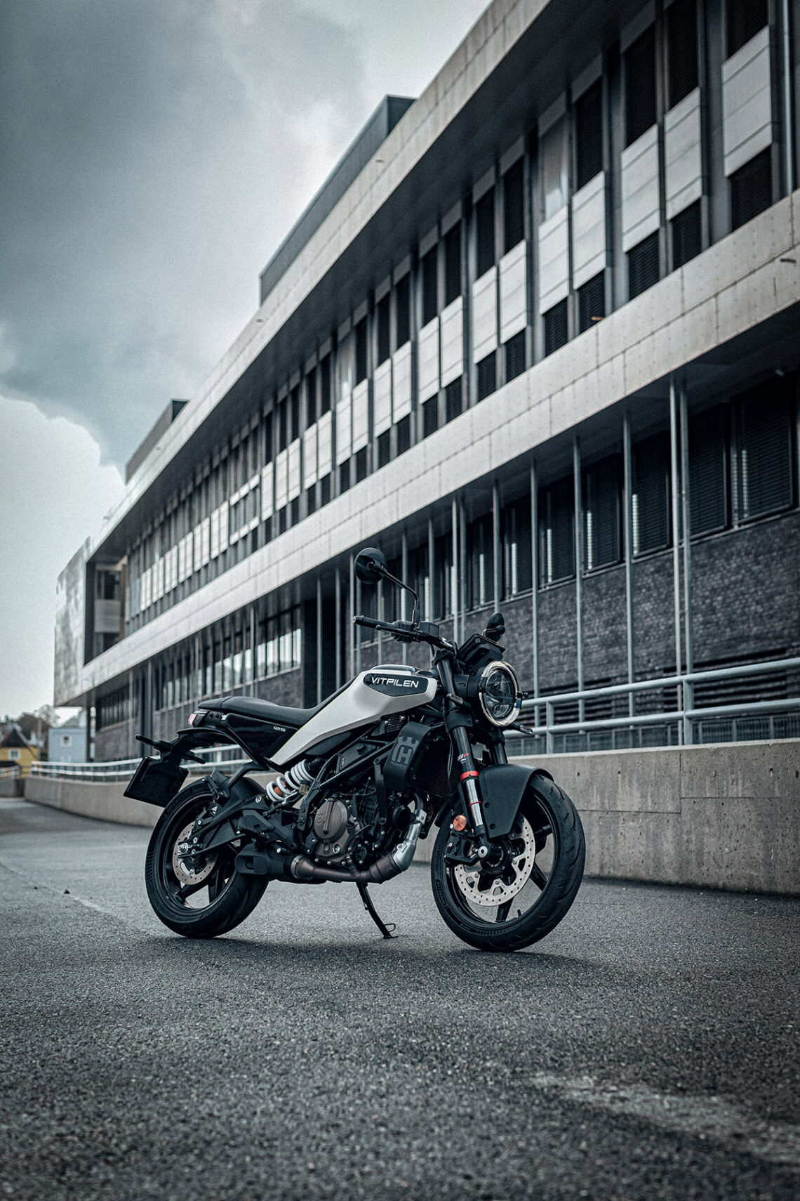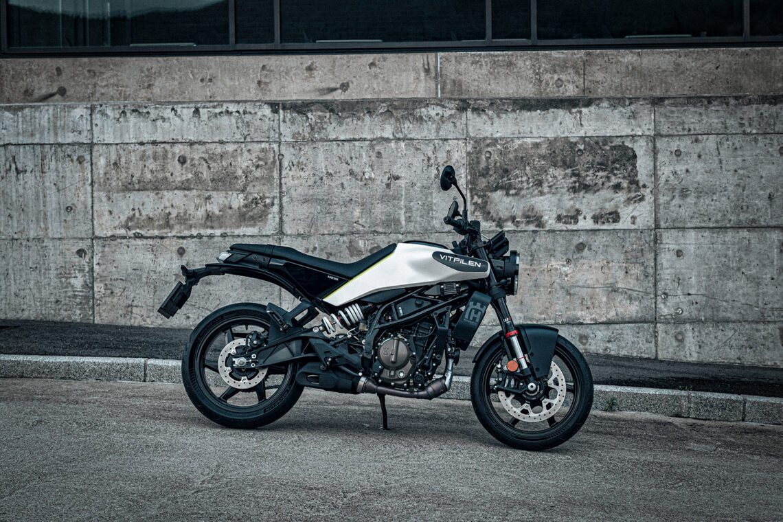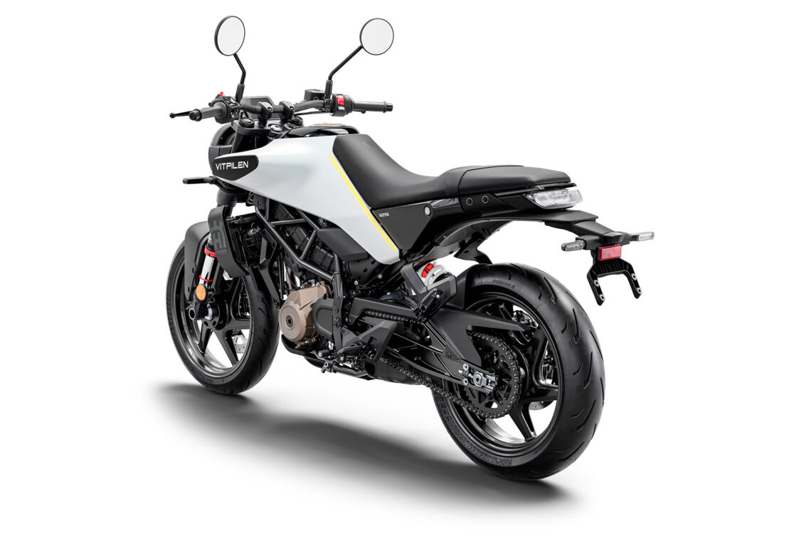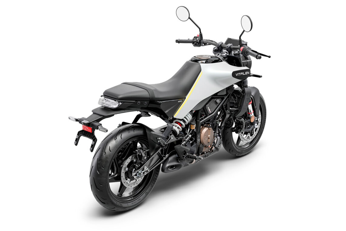 Cuenta con componentes de primera calidad. Para empezar, estrena un chasis multitubular de acero totalmente nuevo que se sigue caracterizando por su agilidad. Se combina con un nuevo basculante ligero de aluminio, nuevo subchasis multitubular atornillado, suspensiones WP Apex ajustables (horquilla invertida de 43 mm y 150 mm de recorrido de cartucho abierto regulable en compresión y extensión junto a monoamortiguador trasero con mismo recorrido ajustable en precarga y extensión) y frenos ByBre (disco delantero de 320 mm y trasero de 240 mm). En esta evolución, aumenta la distancia entre ejes (aporta mayor estabilidad) mientras que la altura del asiento se ha rebajado hasta los 820 mm (15 mm menos). Las Vitpilen instalan un nuevo manillar muy ligero que permite una gran respuesta a la dirección, más alto y recto alejándose del estilo cafe-racer más radical de modelos anteriores en sus cilindradas superiores, aunque sigue confiando en ruedas de 17" con llantas de aluminio y neumáticos Michelin Power 6 de puro asfalto.