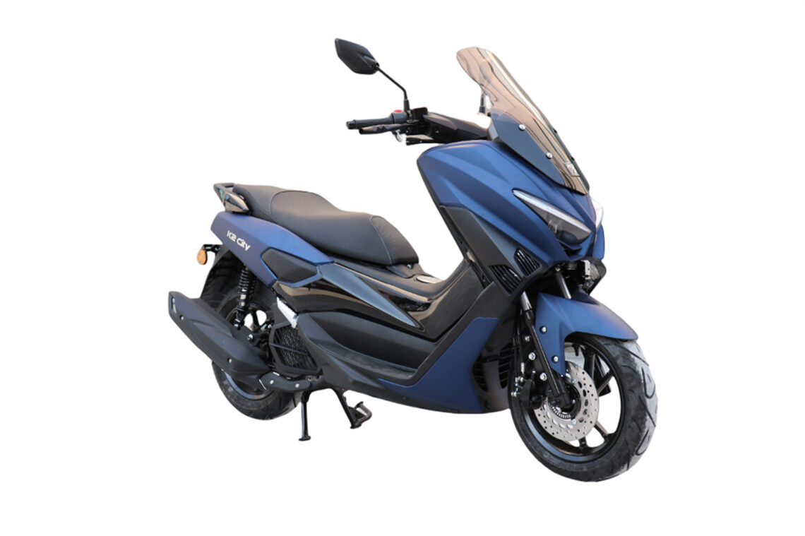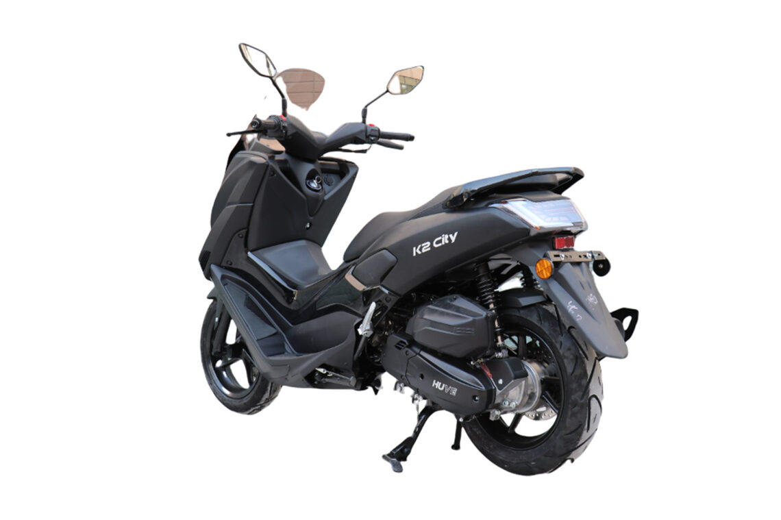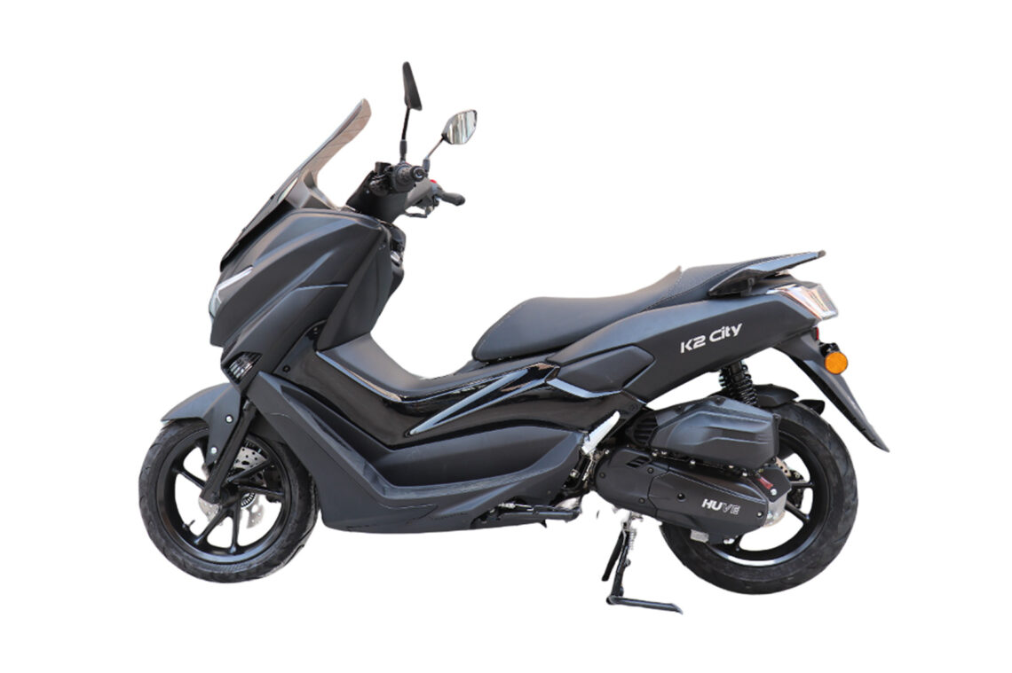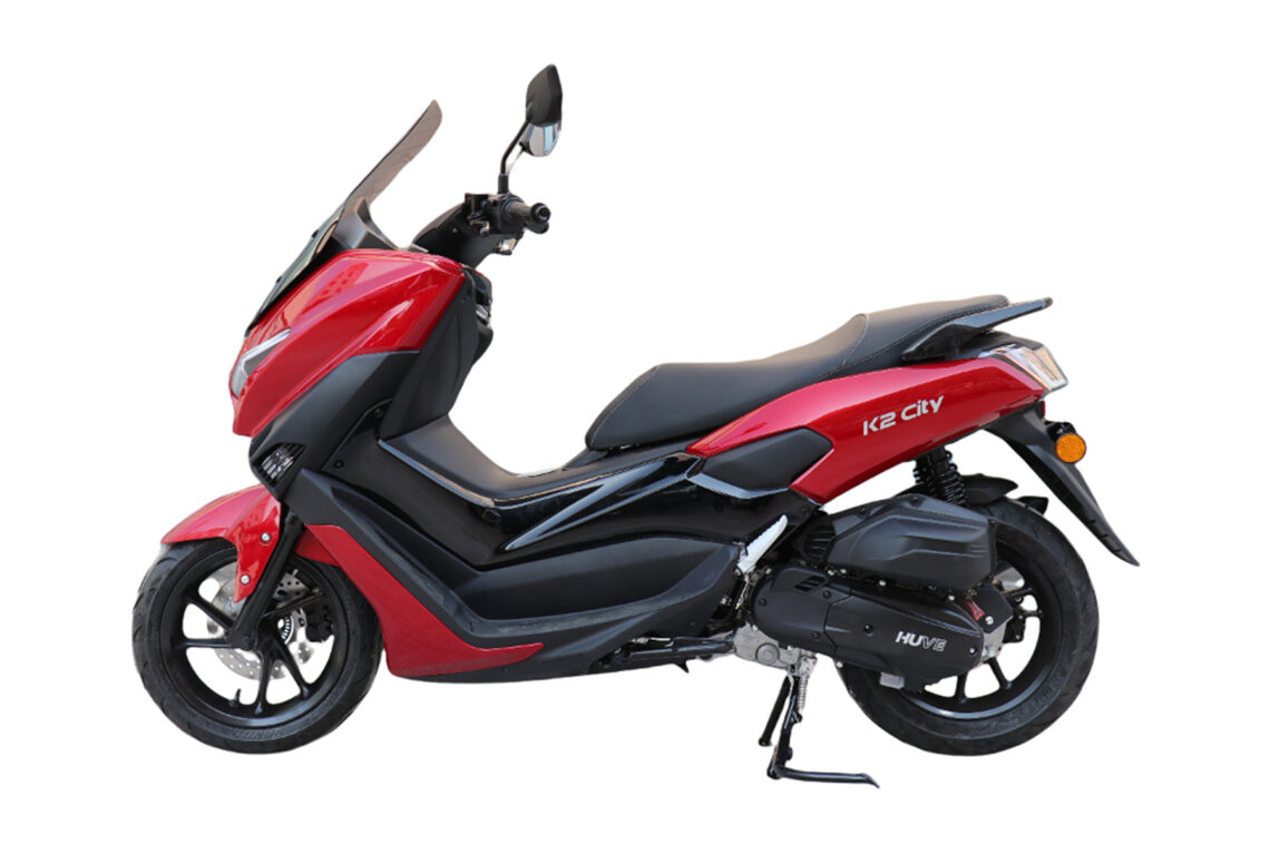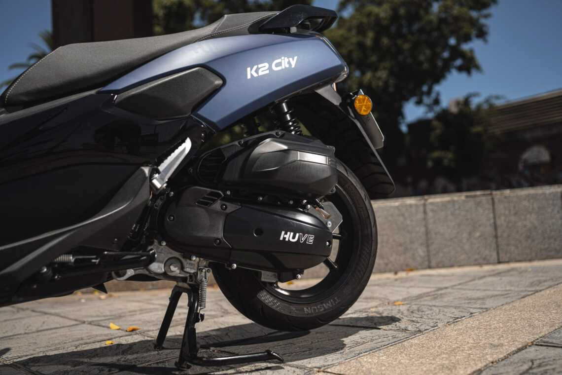 Este scooter 125 se mueve gracias a un monocilíndrico refrigerado por agua y que declara 13 cv de potencia. Uno de los puntos fuertes del Huve K2 City y que elevan su nivel en cuanto a relación calidad-precio es su equipamiento, ya que encontramos una pantalla TFT a color muy atractiva y clara, pero también tiene detalles como la llave inteligente o una doble toma USB para recargar dispositivos. Las estriberas del pasajero son plegables y bajo el asiento encontramos espacio suficiente para guardar un casco jet y algunos objetos más. Las llantas son de 13" mientras que en cada eje encontramos un disco de freno, ambos trenes con frenada combinada CBS.