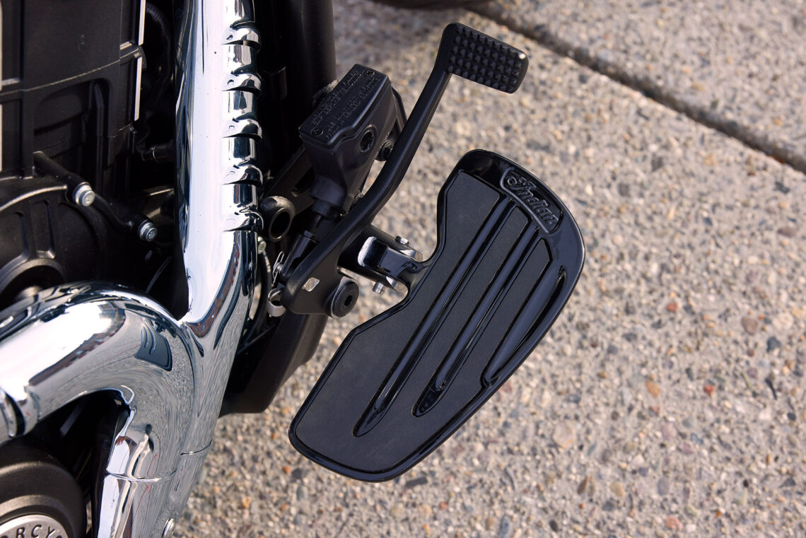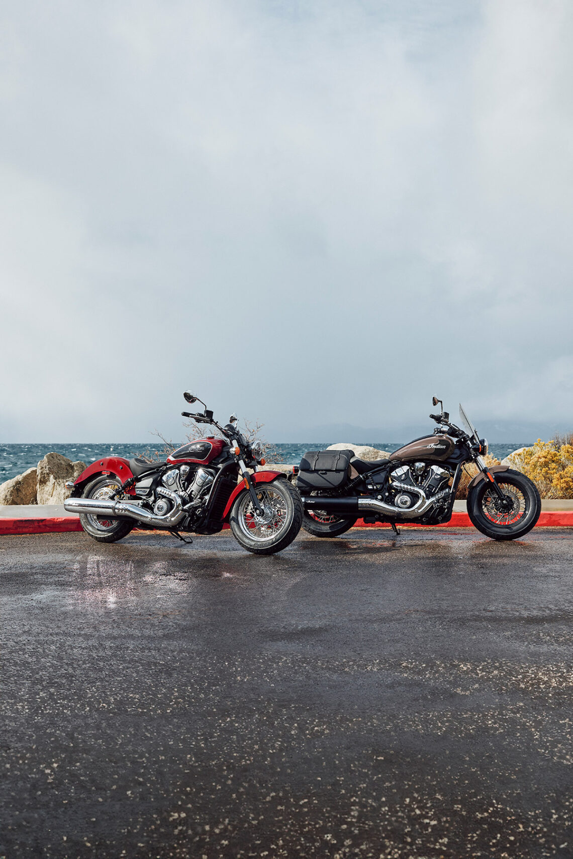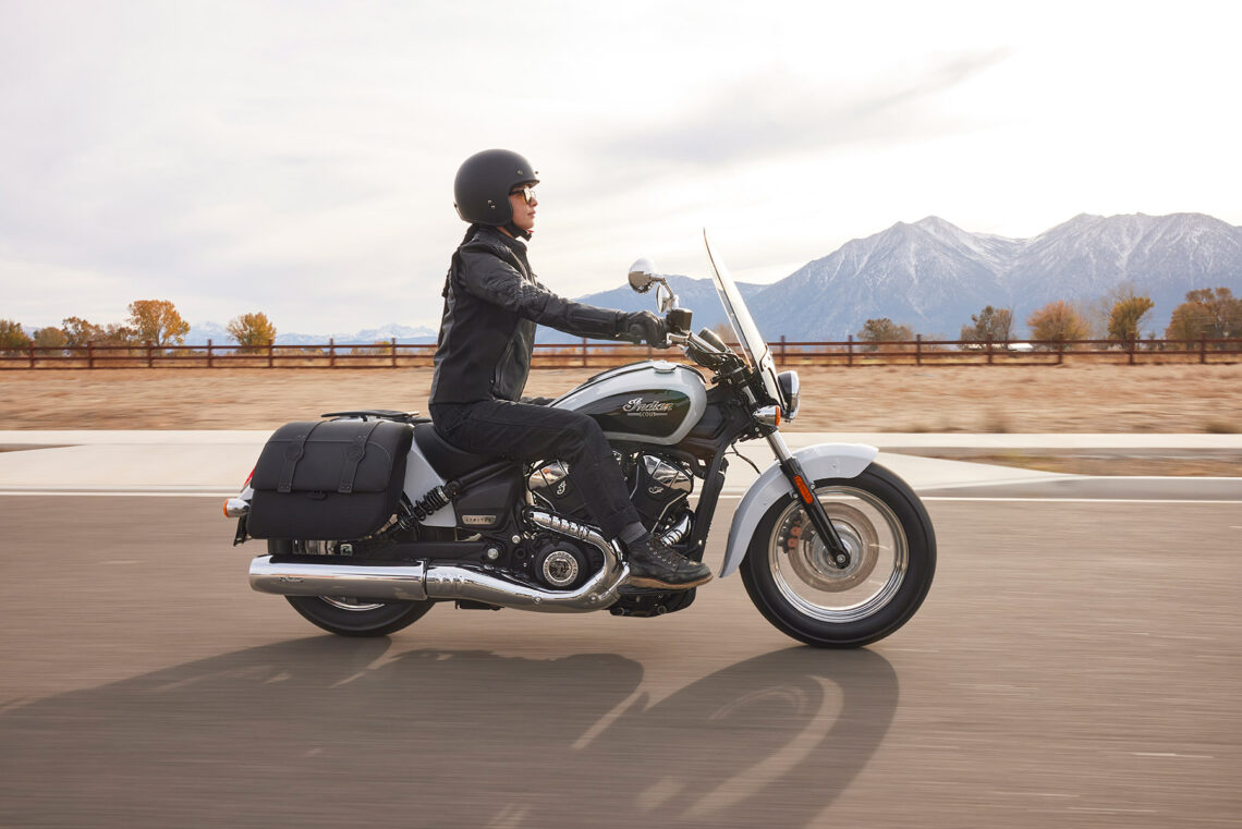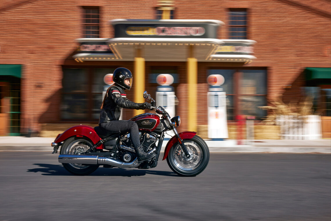 El icónico bicilíndrico se instala dentro de un nuevo chasis multitubular de acero, alrededor del cual se construye una propuesta que sigue los cánones estéticos de una motos Indian clásica. Las suspensiones se componen de una horquilla convencional delantera de 41 mm con 120 mm de recorrido junto a una doble amortiguación trasera de 76 mm de recorrido con ajuste de precarga. Para los frenos, encontramos un disco de 298 mm en cada eje, con una pinza de doble pistón delante y una de pistón simple detrás.