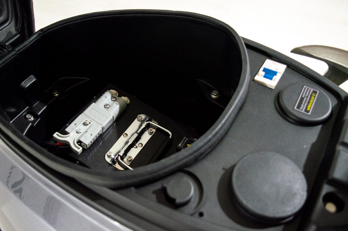 La batería de iones litio está firmada por LG, líderes entre los fabricantes de estos productos, y forma parte de un paquete extraíble que permite la carga tanto en la propia moto como en casa o en la oficina. Su capacidad es de 2,9 kWh alcanzando una autonomía de 75 km. El tiempo de recarga a través de un enchufe convencional tipo Schucko en 5 ó 6 horas.