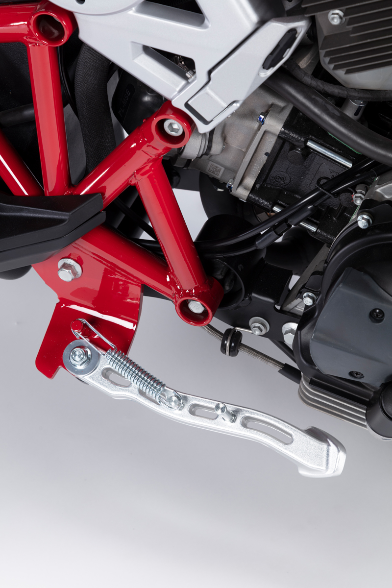 No puede faltar su robusto marco enrejado de tubos de acero, pero para este modelo han renovado su frontal, más voluminoso y con apéndices a lo ‘alta competición’ en la zona baja para rematar su agresivo y deportivo aspecto.