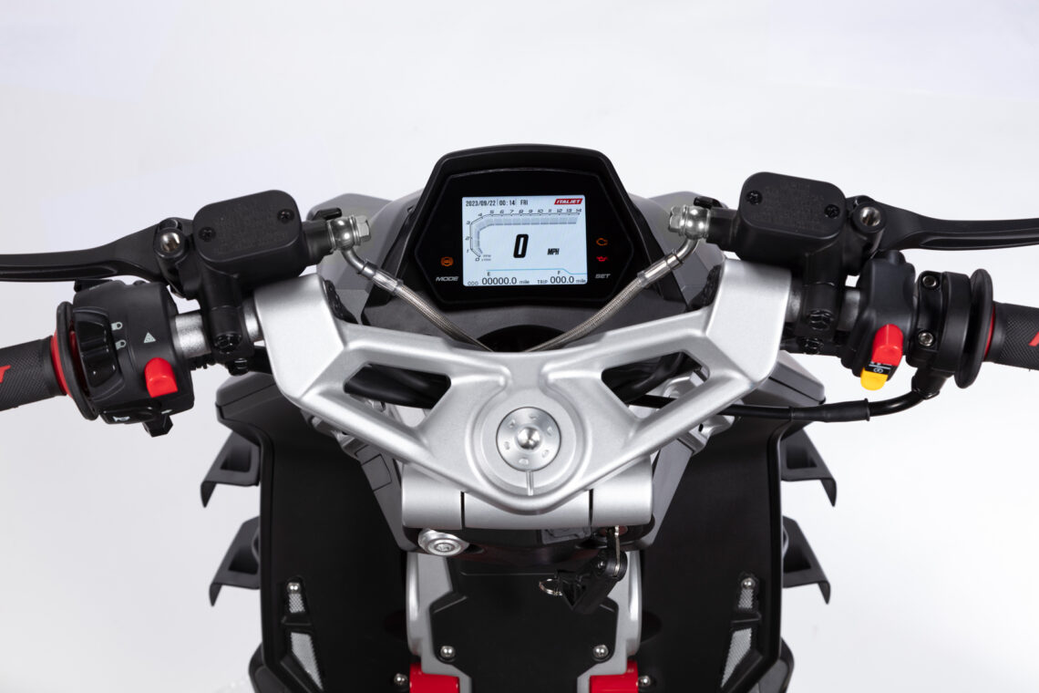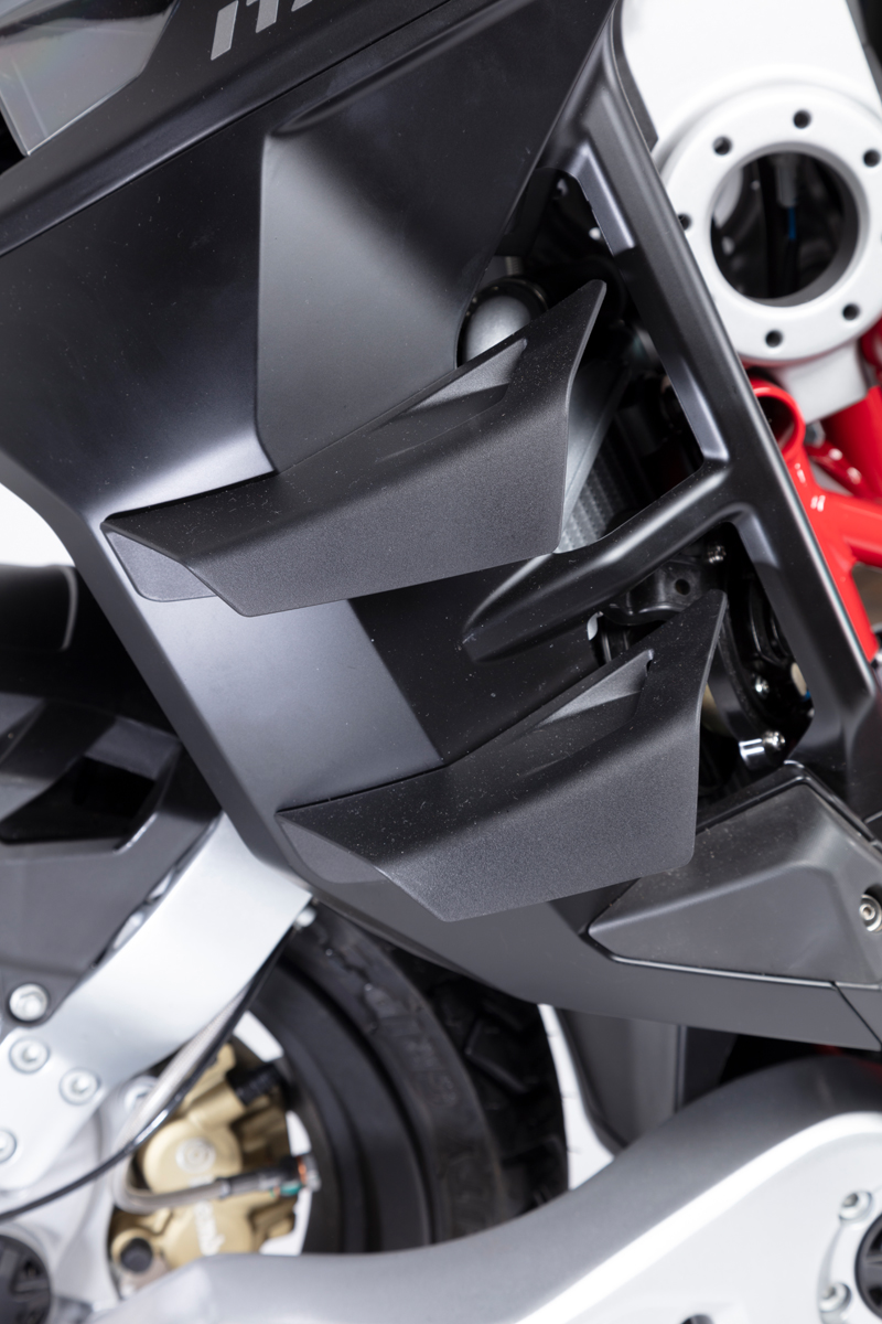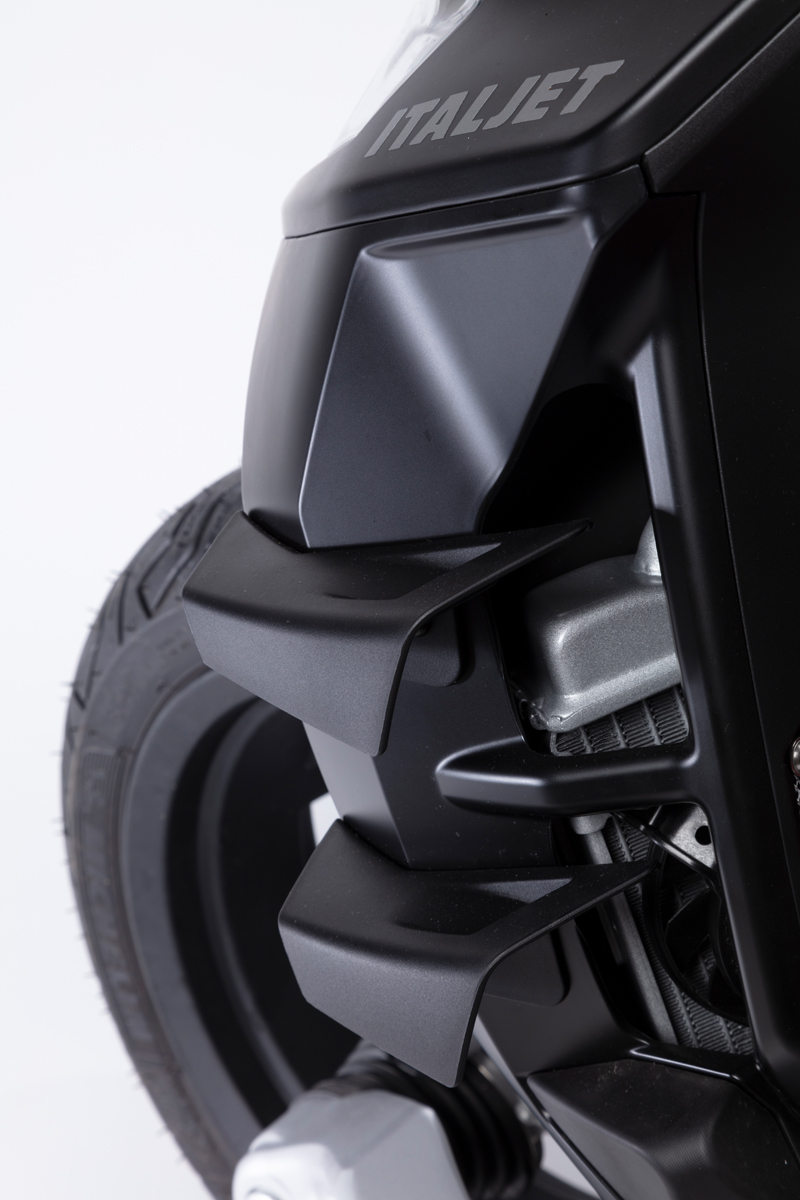 Respecto a su parte ciclo, dispone del sistema patentado de dirección independiente, con amortiguadores tanto delante como detrás y su particular brazo delantero con el que ya sorprendieron al mundo en la década de los 90. En cuanto a frenos, dispone de un disco delantero de 240 mm y trasero de 175 mm, mordidos por pinzas Brembo y con ABS. Su rueda delantera es de 12", mientras que la trasera es de 13", ambas combinadas con neumáticos de calidad.