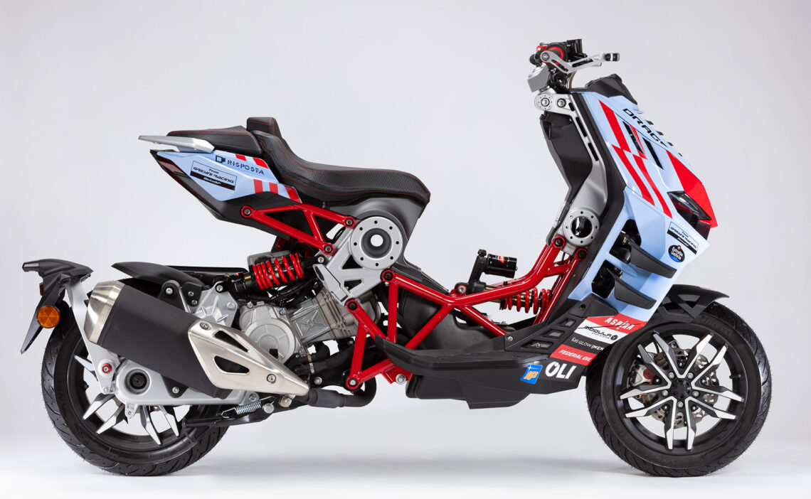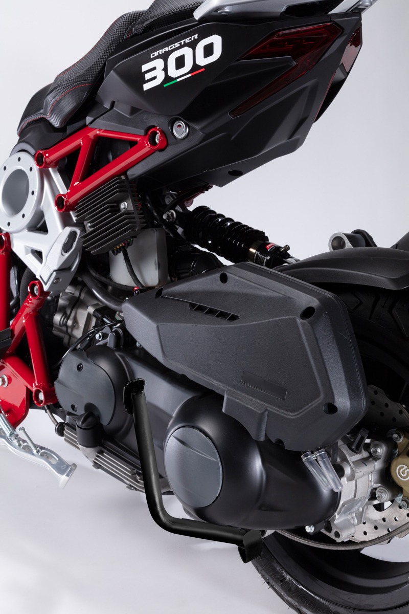 En cuanto a su motor, es un monocilíndrico de 278 cc que da una potencia de 23,8 CV (17,5 kW) a 8.250 rpm, y un par máximo de 26 Nm a 6.250 rpm. Unas cifras que, sumado a su rebajado peso en seco de 128 kg, lo convierten en un scooter de competición, más que digno para circuitos.