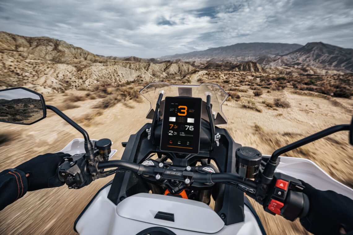En su equipamiento no falta una faro LED mejorado, con funciones cuneteras e incrustado de diferente manera en las formas de la moto. También trae la conectividad KTMConnect, control de presión TPMS y control de crucero. Si deseas mejorarlo, puedes añadir como extra el mencionado modo Rally, luz de frenada de emergencia, el radar frontal (control de crucero adaptativo, asistencia al frenado, aviso de colisión y aviso de distancia), el cambio rápido, el asistente en pendiente y el control de crucero con Stop & Go.
