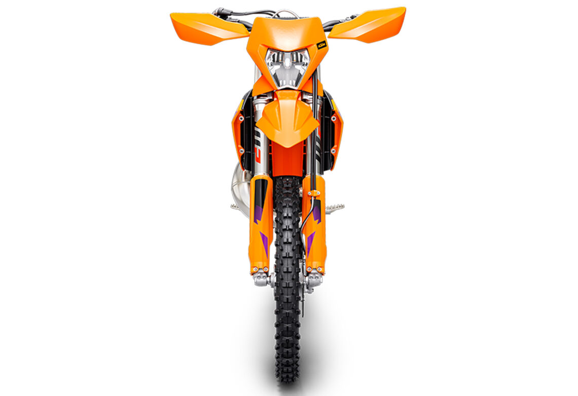 Uno de los componentes más innovadores de estas KTM 2024 de enduro están en sus suspensiones. Delante monta una horquilla WP XACT de 48 mm de cartucho cerrado con un nuevo concepto de válvula central, el cual optimiza la fluidez del aceite por el interior, lo que repercute en mejores características de amortiguación y evitando la formación de espuma no deseada en el aceite. Cuenta con un nuevo tope hidráulico en los últimos 68 mm de recorrido para mantener la máxima compresión. Tiene nuevos protectores de retenes. Además, la horquilla ha aumentado su recorrido de 292 a 300 mm. Es ajustable fácilmente en rebote y compresión con clicks sin necesidad de herramientas.