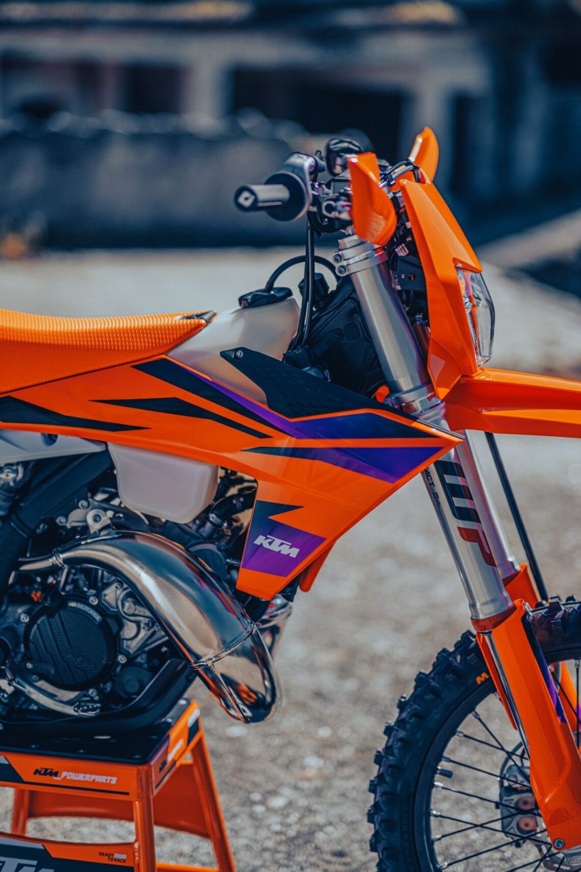 Si nos fijamos en la carrocería, se inspira en los principios de los noventa, con el morado ganando protagonismo, aunque el naranja sigue siendo el principal. El depósito es nuevo, con 9 litros, hecho de polietileno XPE y transparente, con nueva bomba de una pieza y filtro. El diseño del airbox ahora permite un flujo de aire máximo y el mejor filtro Twin Air, accesible fácilmente sólo quitando el panel izquierdo. El sellado del airbox ante suciedad y agua es mejor gracias a un nuevo protector interno.